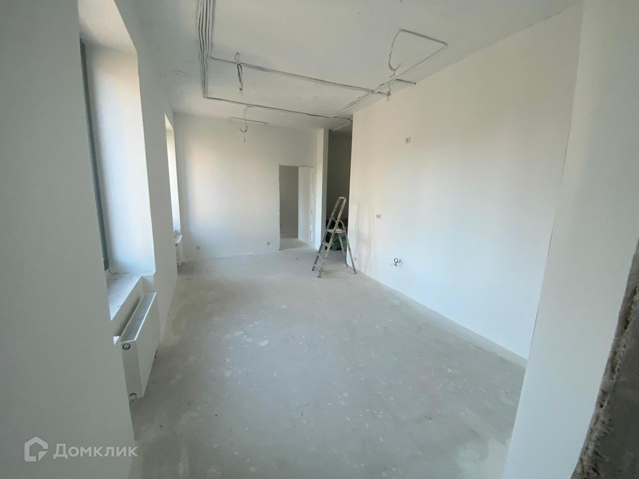 Отделка подчистовая.На полах стяжка и гидроизоляция,стены выровнены и оштукатурены,выведены розетки,алюминиевые стеклопакеты на окнах,радиаторы тепла,вывод по сан.технику.