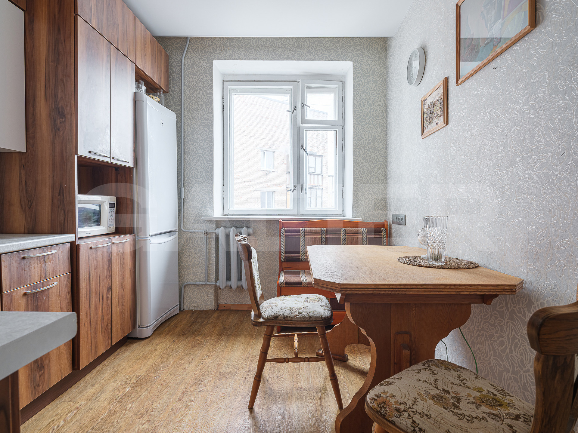 В квартире остается вся мебель и техника: кухонный гарнитур, холодильник, стиральная машина, столы и стулья.