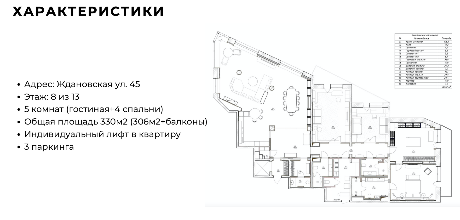 Индивидуальный лифт в квартиру, 3 паркинга (продажа паркингов обсуждается отдельно)