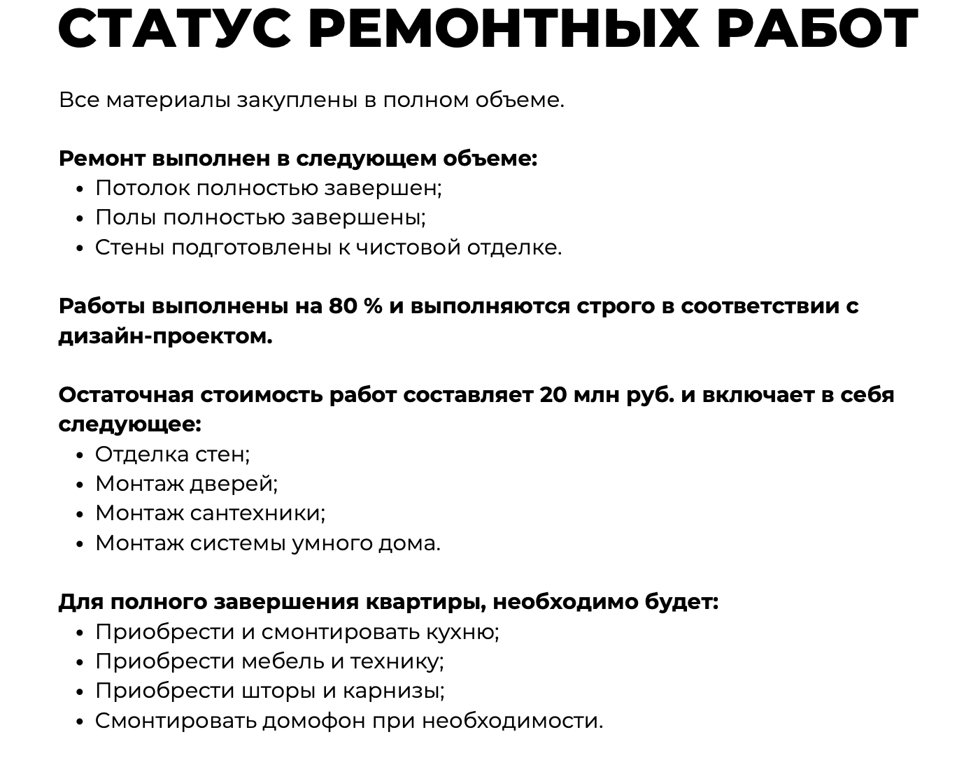 Остаточная стоимость работ составляет 20 млн руб. и включает в себя следующее: