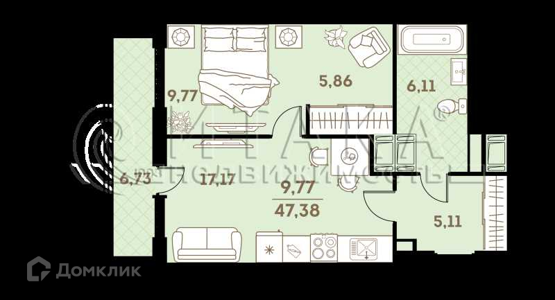 Общая площадь 44.02 м2