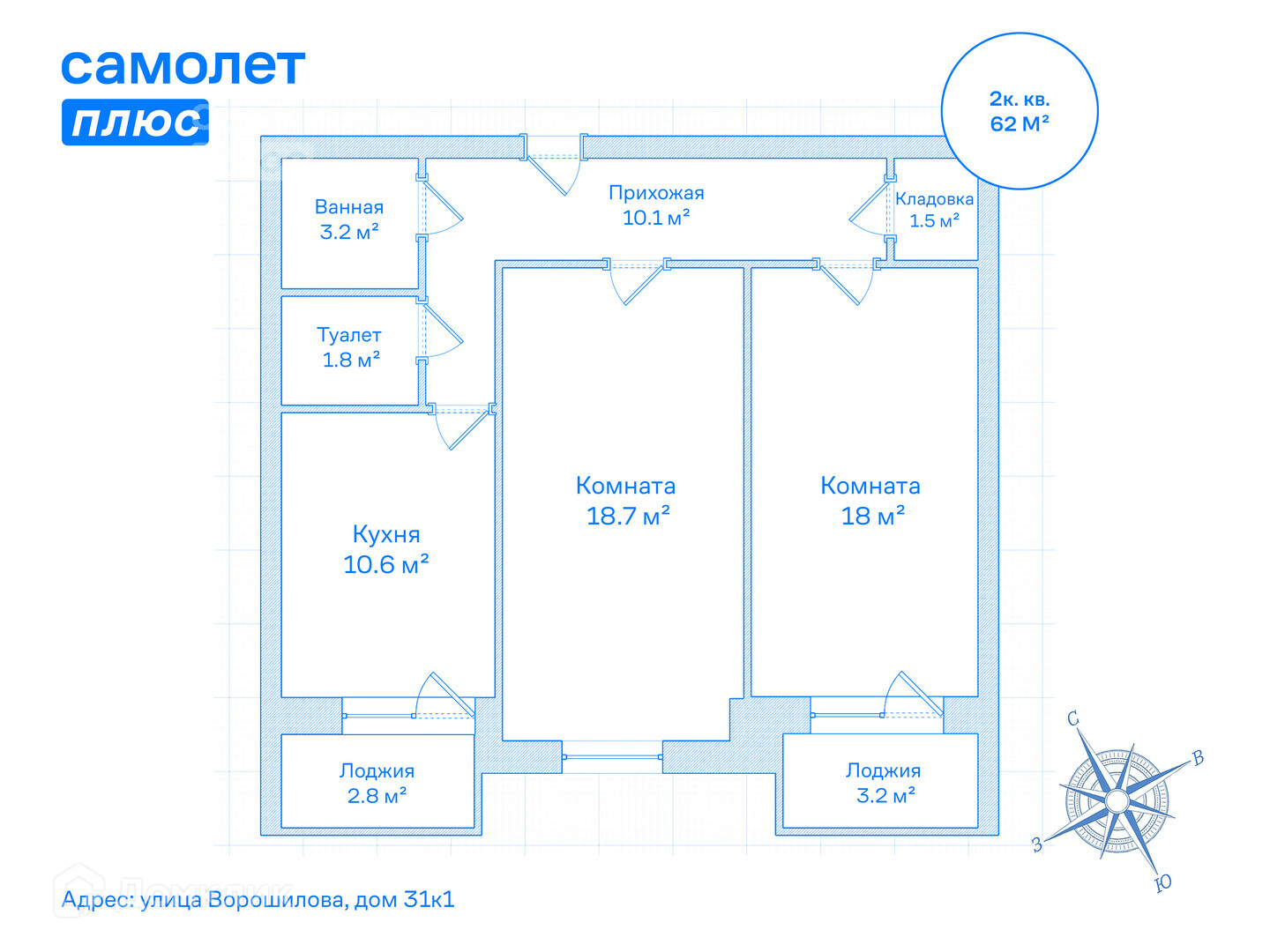 Общая площадь 62.2 м2