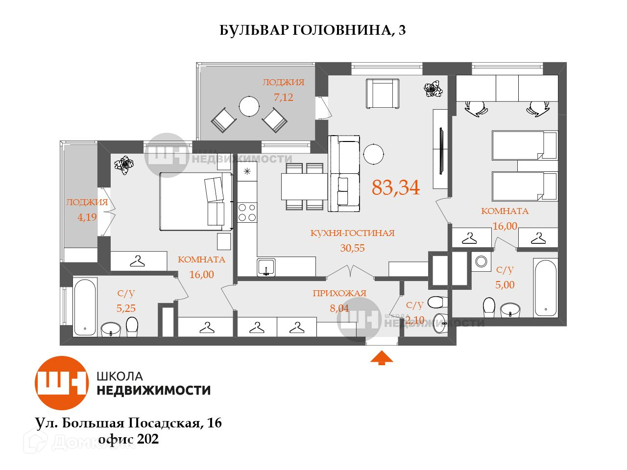 А планировка - чудо как хороша: кухня-гостиная 30,95 кв.м, две спальни по 16 квадратов, три санузла , две лоджии.