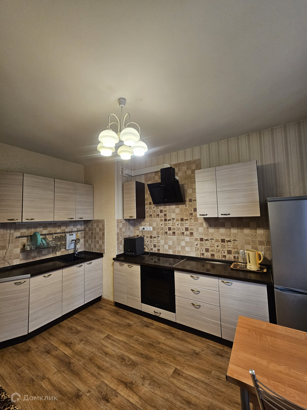 В кухне-гостиной установлен новый кухонный гарнитур, очень вместительный, оборудован техникой: посудомоечная машина фирмы Hansa, духовой шкаф и варочная панель. Из кухни выход на большую застекленную лоджию. Вид из окон во двор.