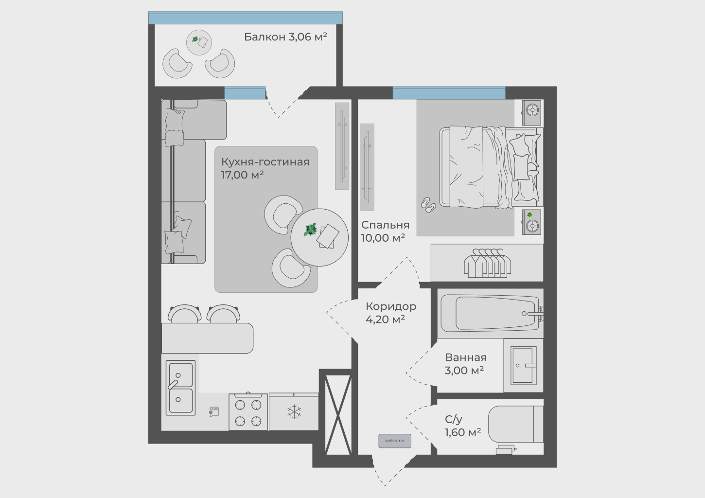 Квартира имеет правильные планировочные решения: просторная кухня-гостиная с большим балконом, спальная комната, раздельный санузел.