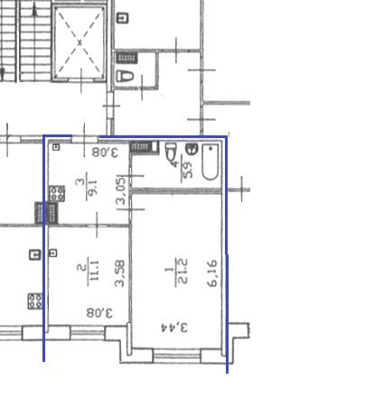 Две изолированные комнаты (21,2 м² и 11.1 м²), просторная кухня-прихожая 9.1 м² , совмещенный большой санузел 5.9 м²