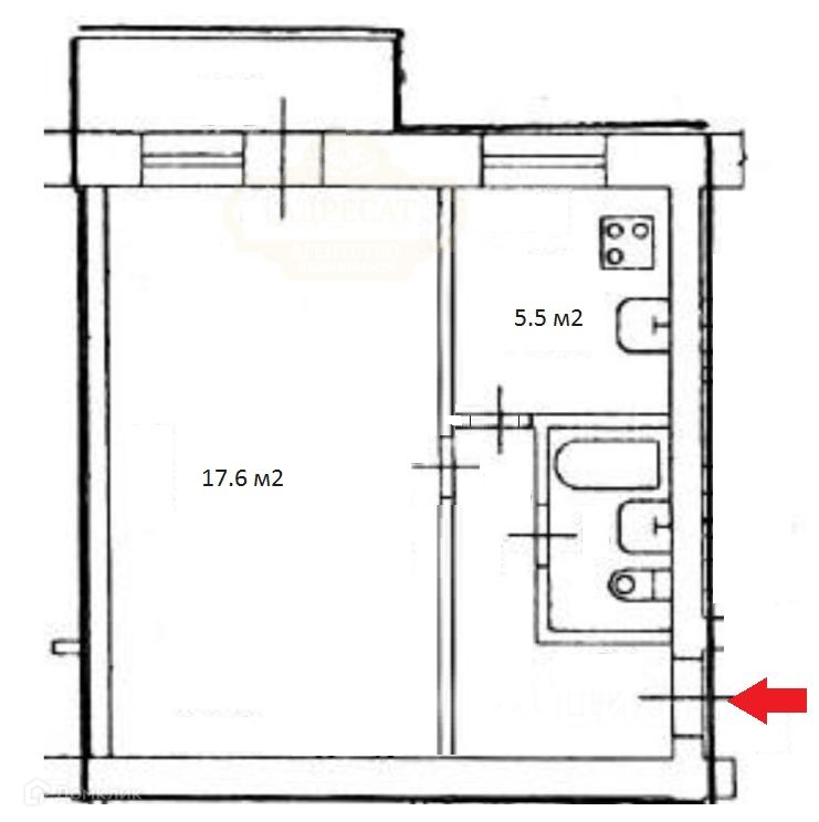 Квартира правильной формы, общей площадью  31 кв.м., комната 17.6 кв.м.,  кухня правильной формы - 5.5 кв.м.