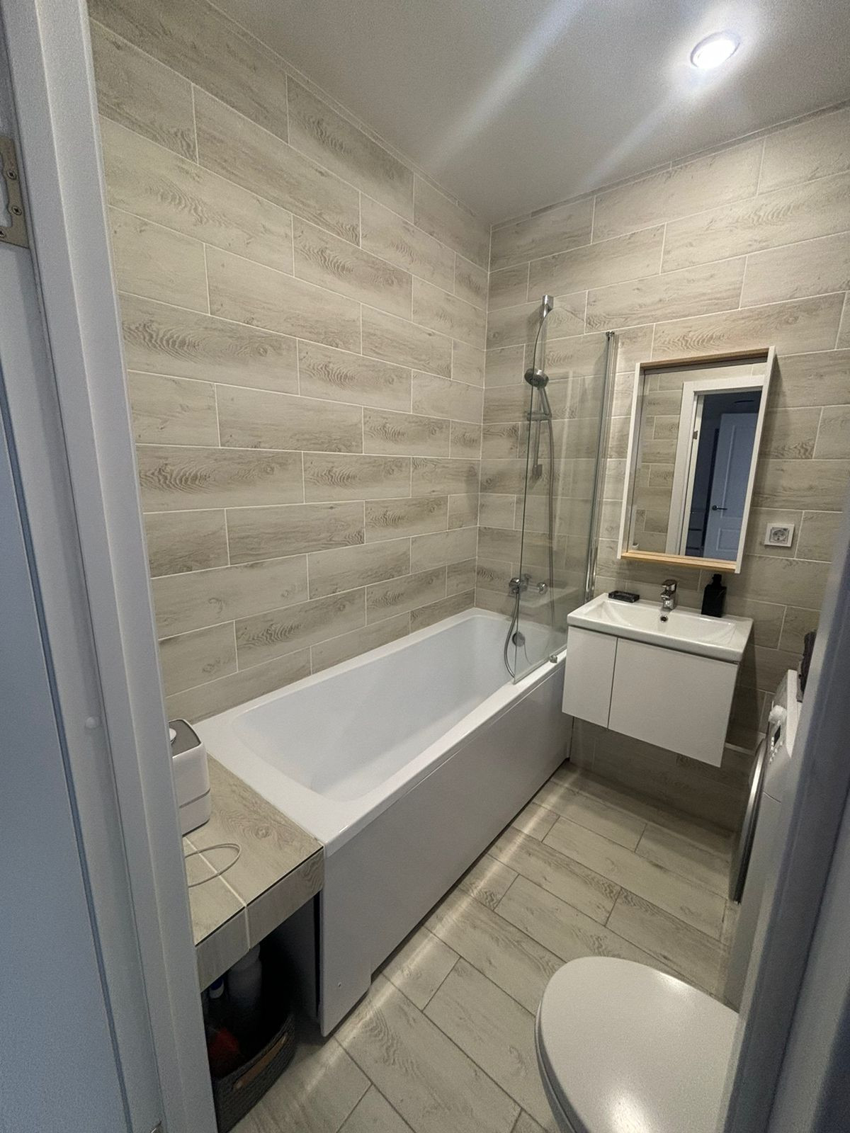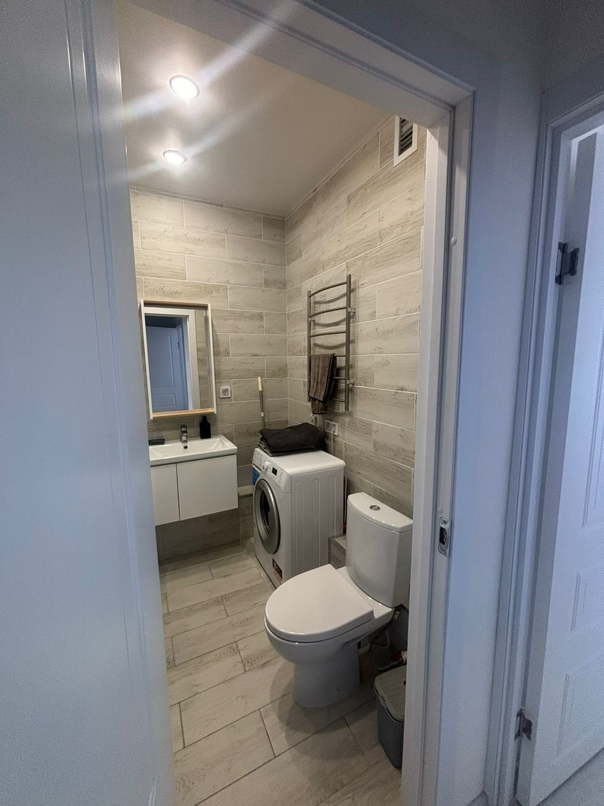 Прихожая имеет место под верхнюю одежду - обувница, много ящиков, полочек, зеркало. Санузел совмещен с ванной, стиральная машина в наличии.