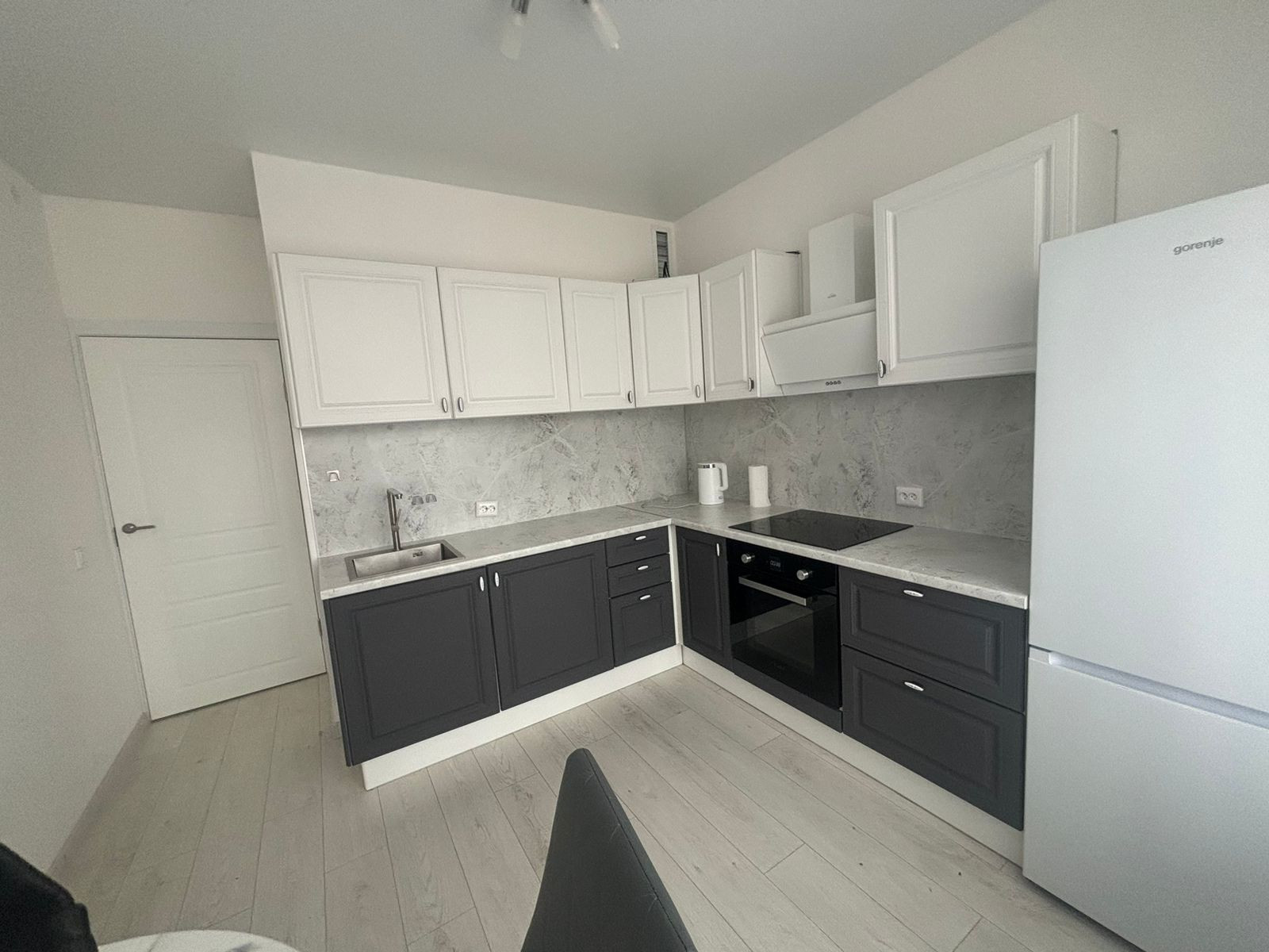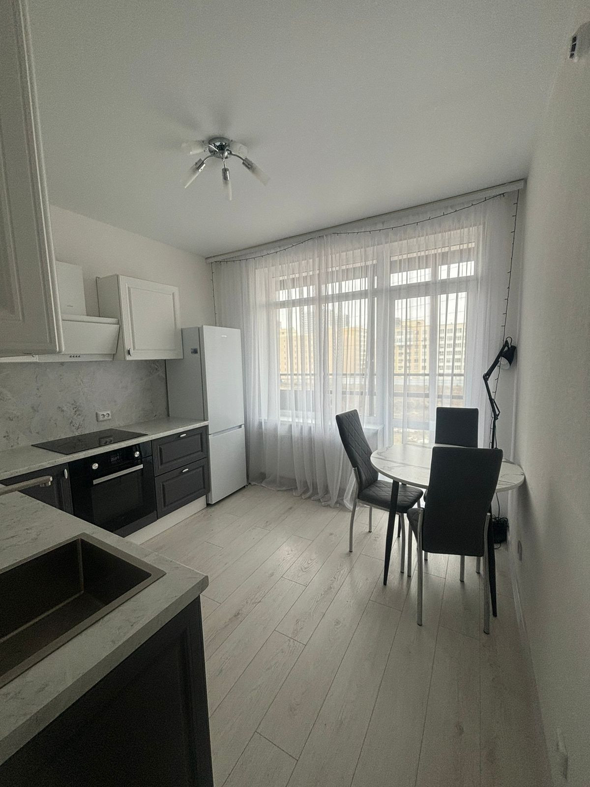 В квартире есть все необходимое для комфортного проживания: функциональная кухня, в которой есть варочная панель, духовой шкаф, микроволновая печь, большой холодильник, вытяжка, круглый стол и очень комфортные стулья. Из кухни можно выйти на просторный балкон (3м2) с освещением.