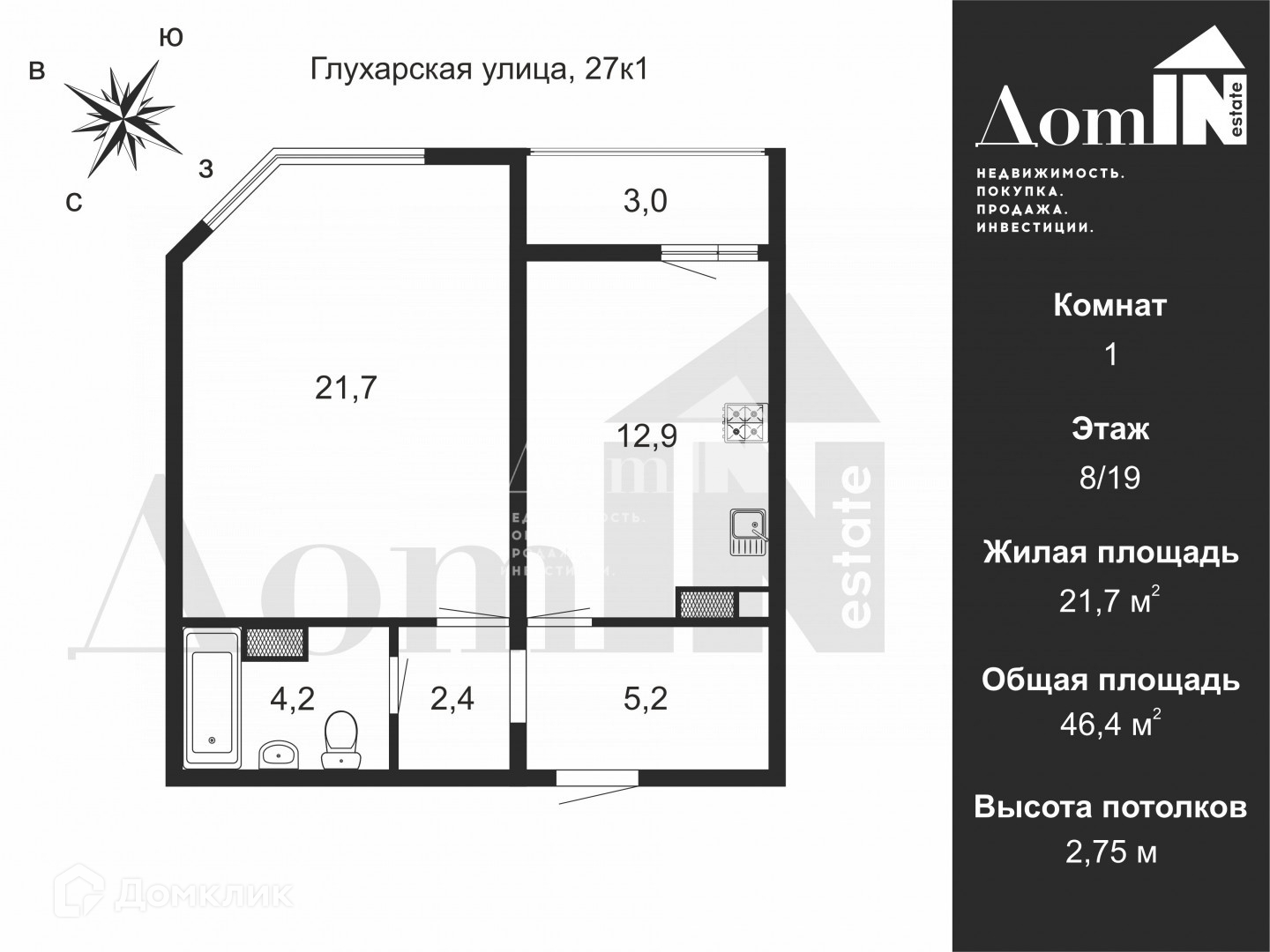 1-комнатная квартира, 46.4 м2, этаж 8 / 19, на продажу в Санкт-Петербурге, Глухарская улица, 27к1