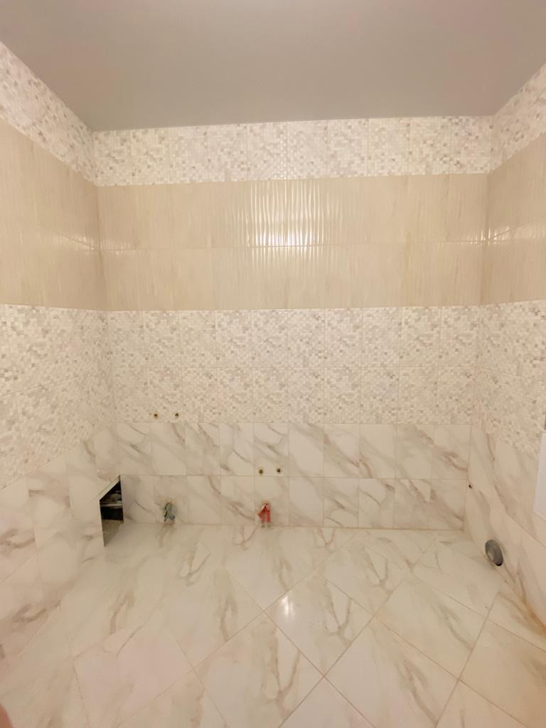 * В ванной комнате нежного бежевого цвета плитка;