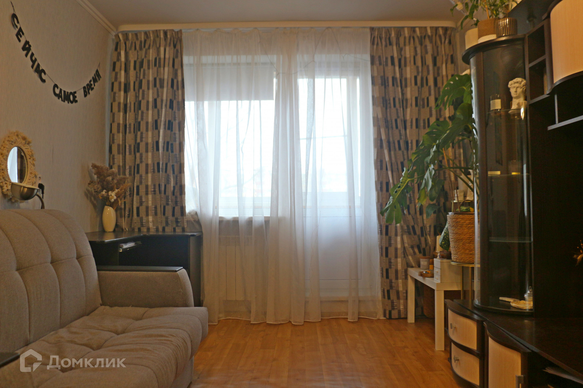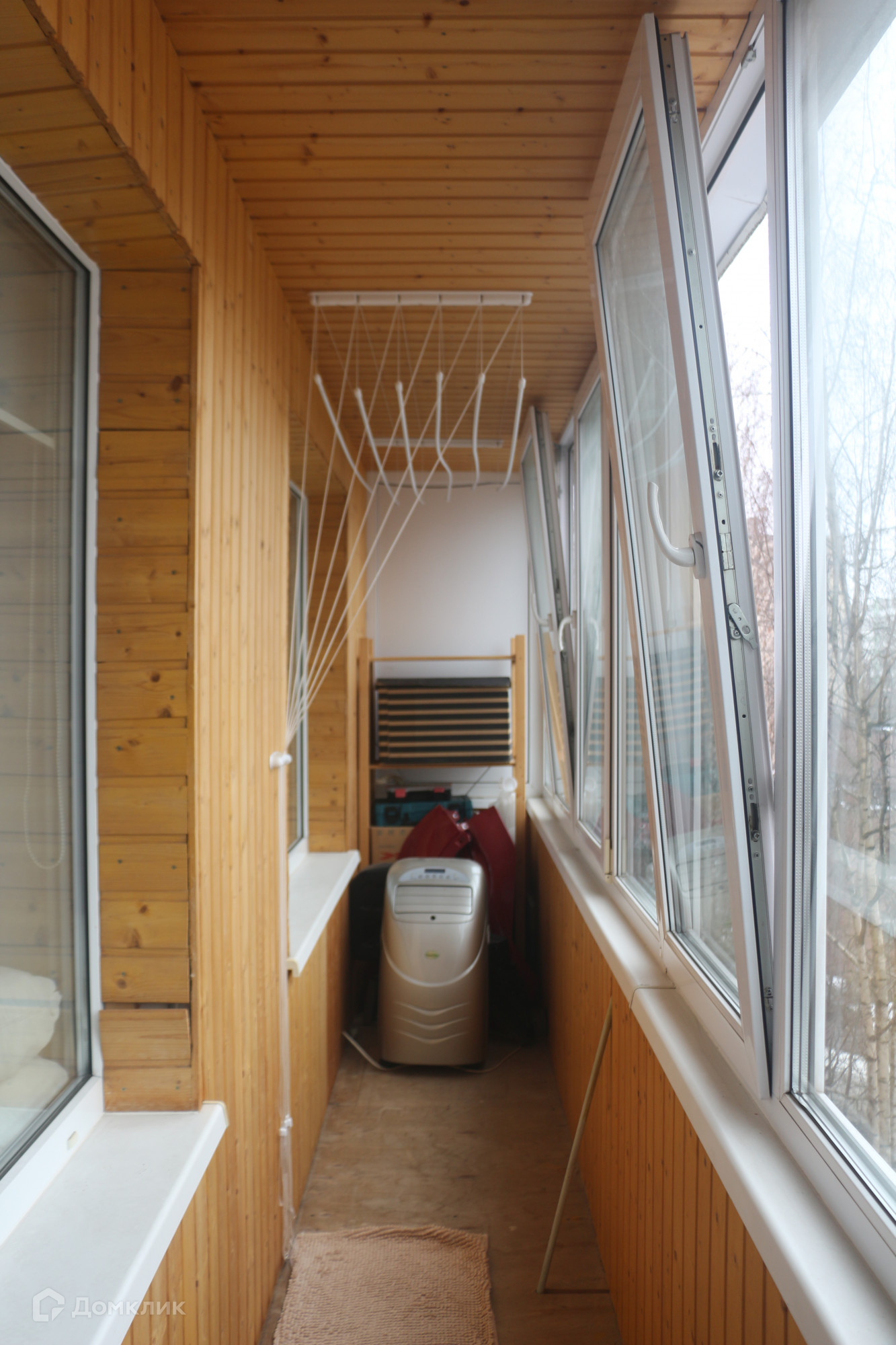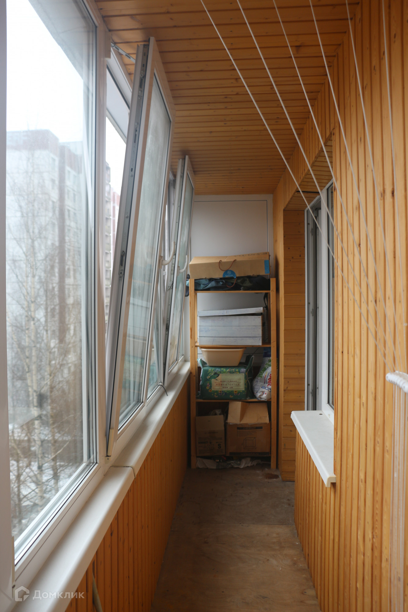 Балкон располагается на всю ширину квартиры застеклён и обшит.
