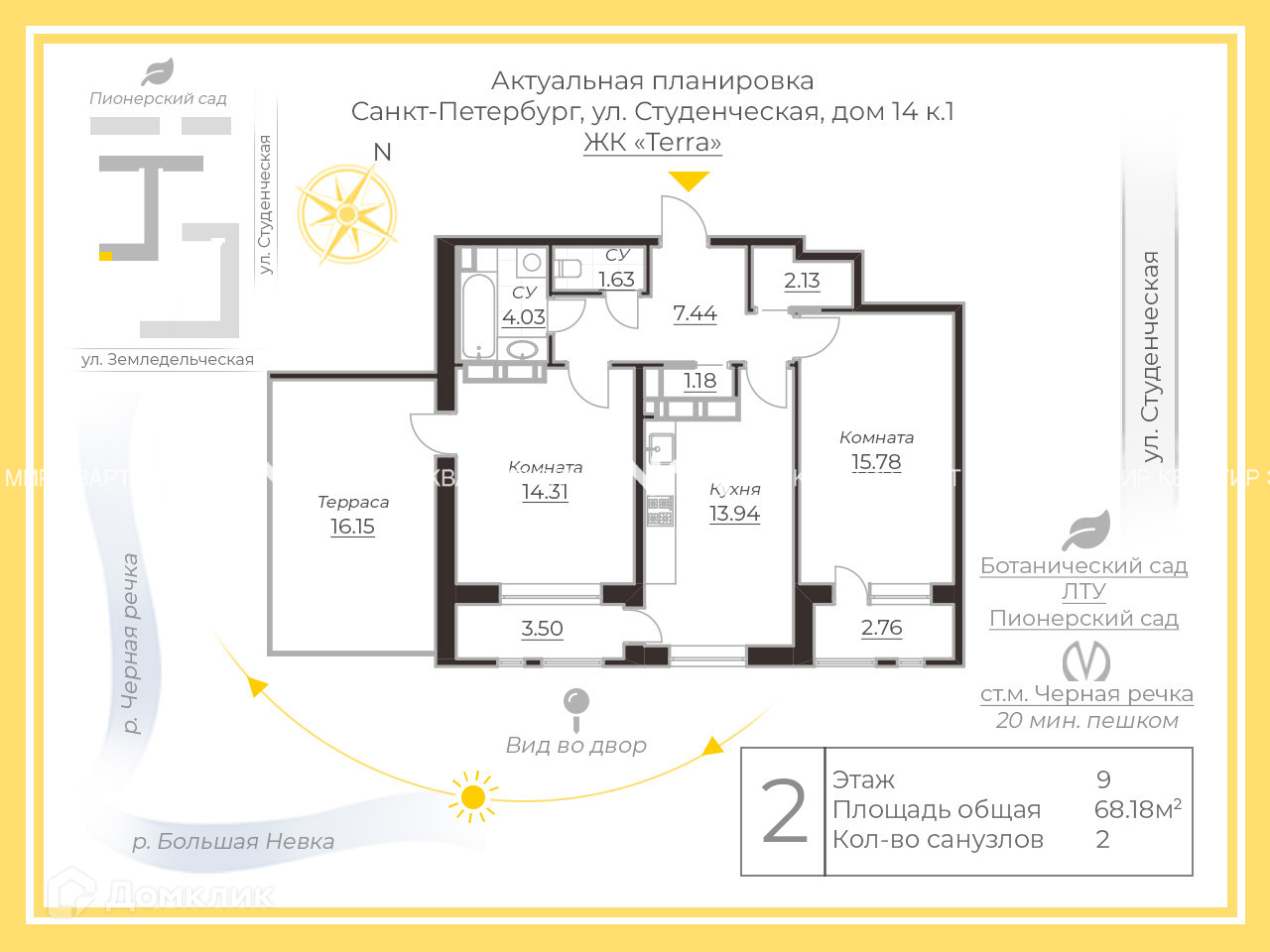 2-комнатная квартира, 68.18 м2, этаж 9 / 14, на продажу в Санкт-Петербурге, Студенческая улица, 14к1