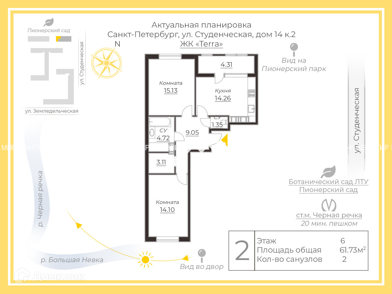 2-комнатная квартира, 61.73 м2, этаж 6 / 14, на продажу в Санкт-Петербурге, Студенческая улица, 14к2