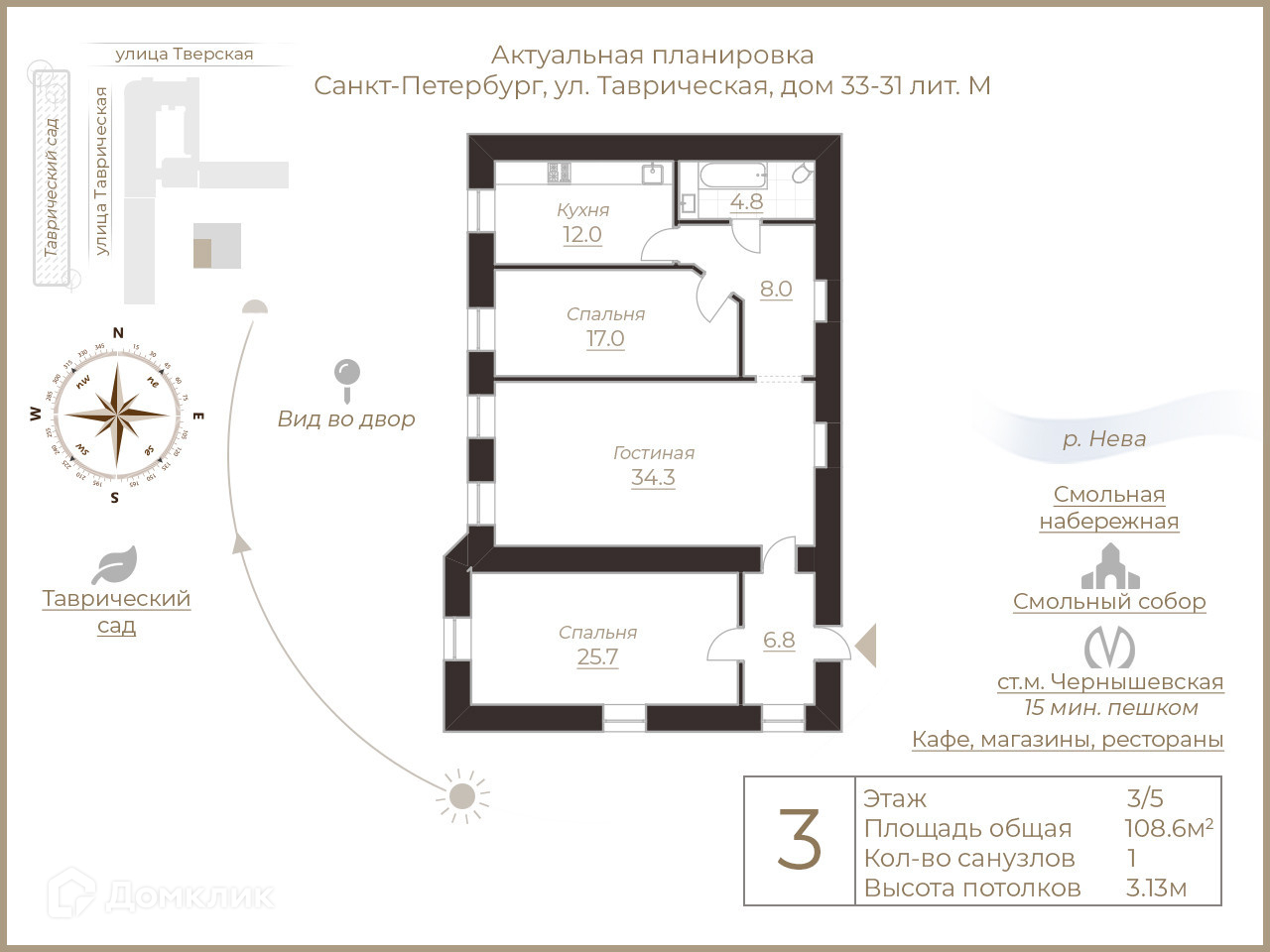 3-комнатная квартира, 108.6 м2, этаж 3 / 5, на продажу в Санкт-Петербурге, Таврическая улица, 31-33М