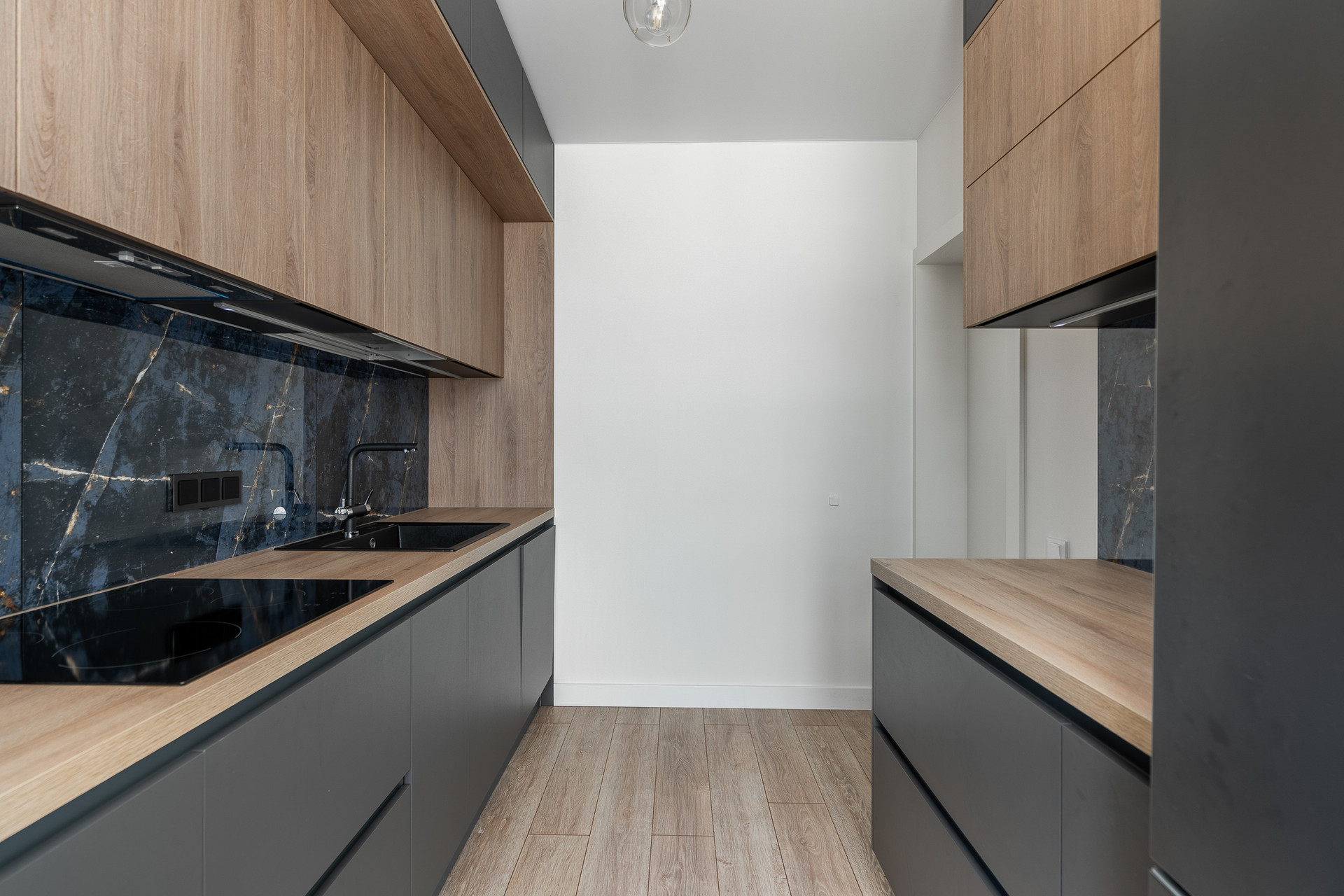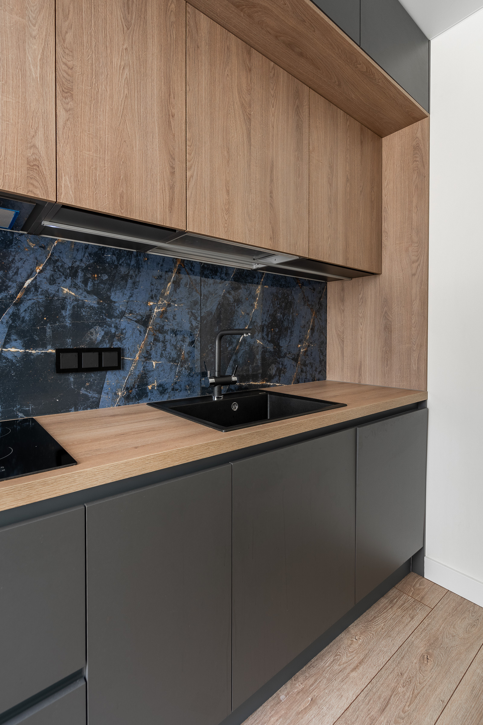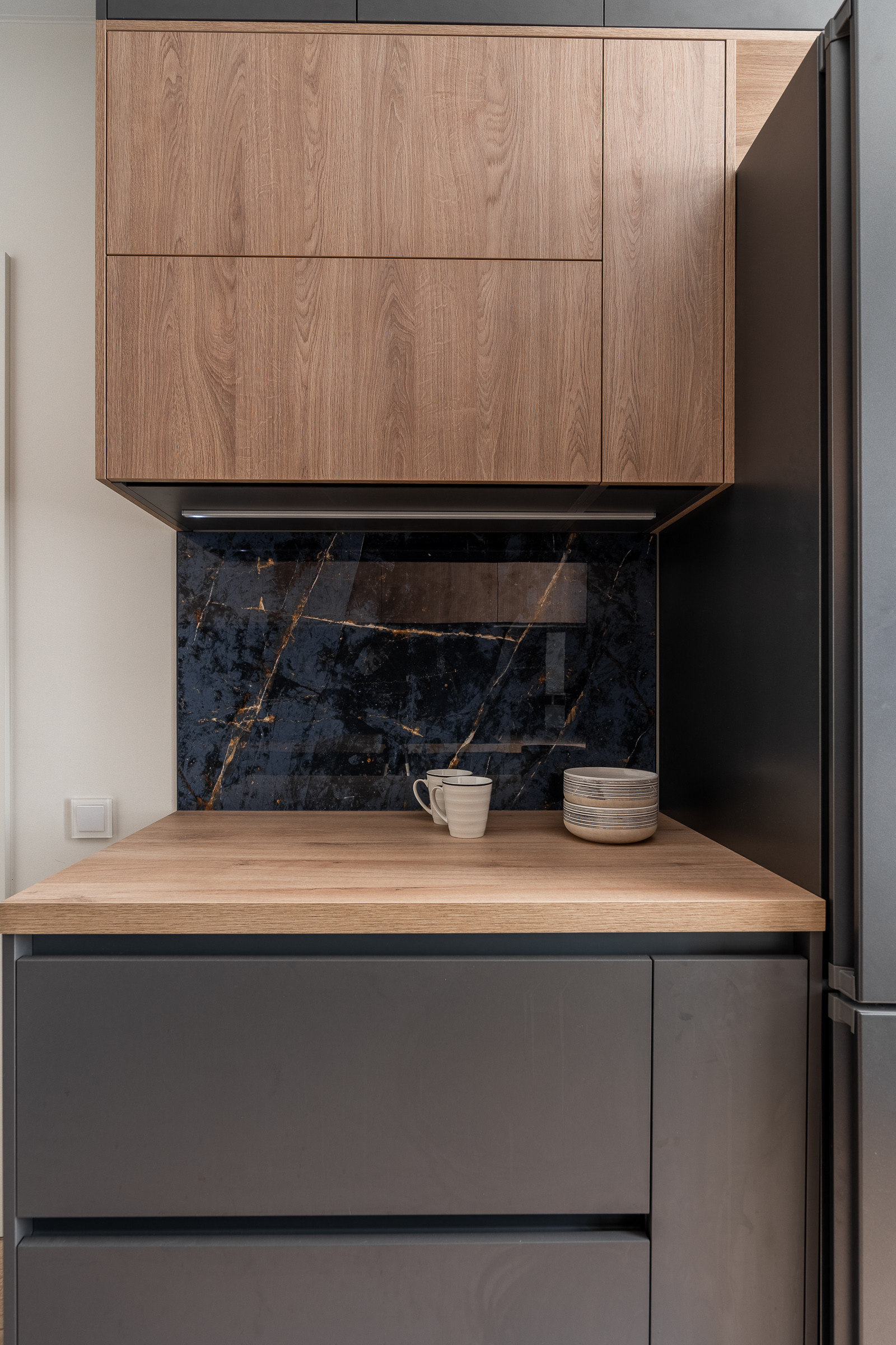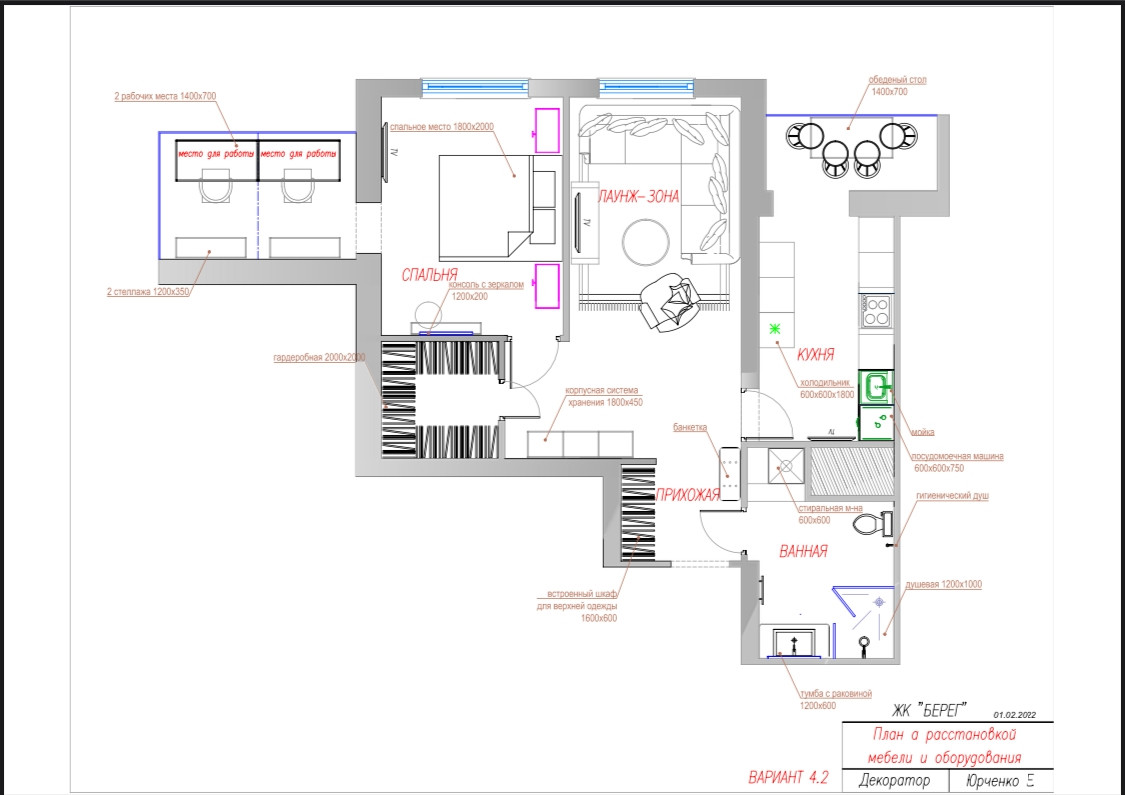 Мебель на кухне и шкаф в прихожей выполнены по индивидуальному заказу.