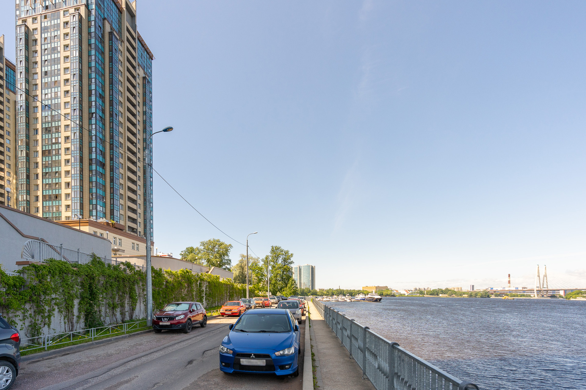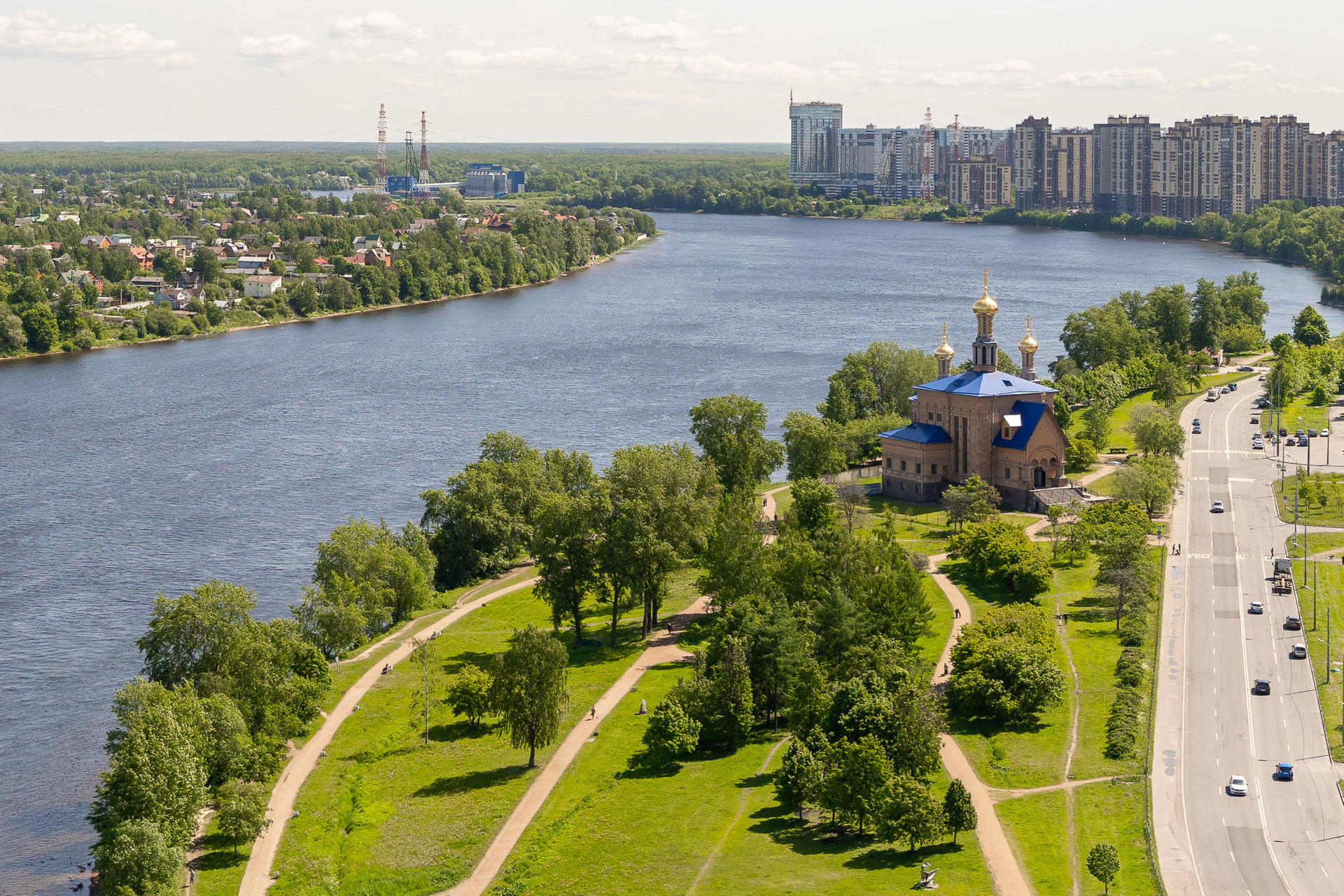 Комплекс расположен в парковой зоне на берегу Невы.