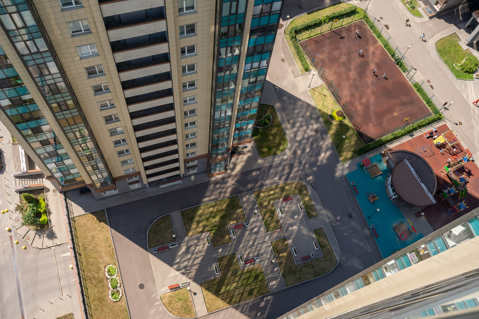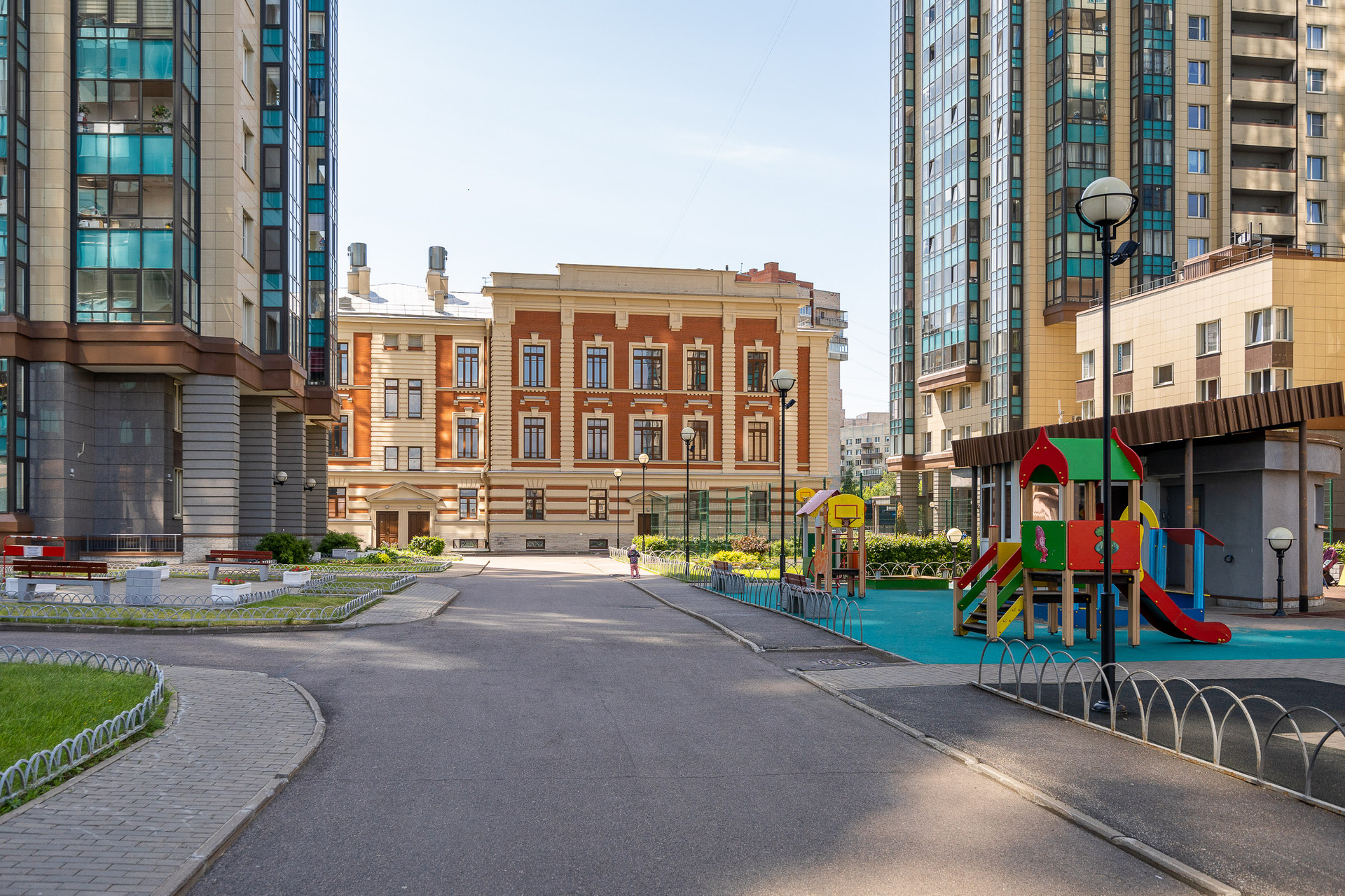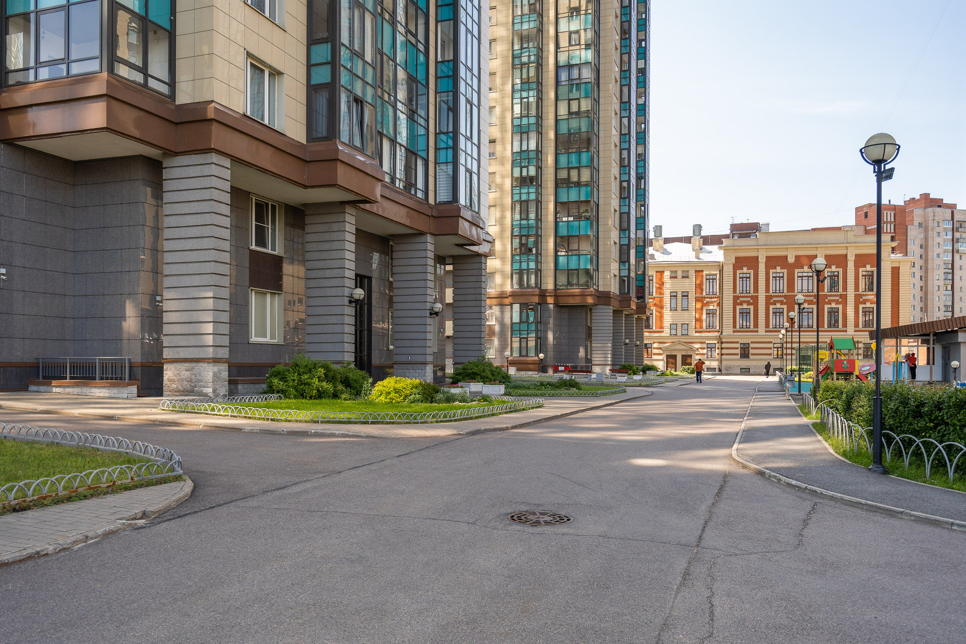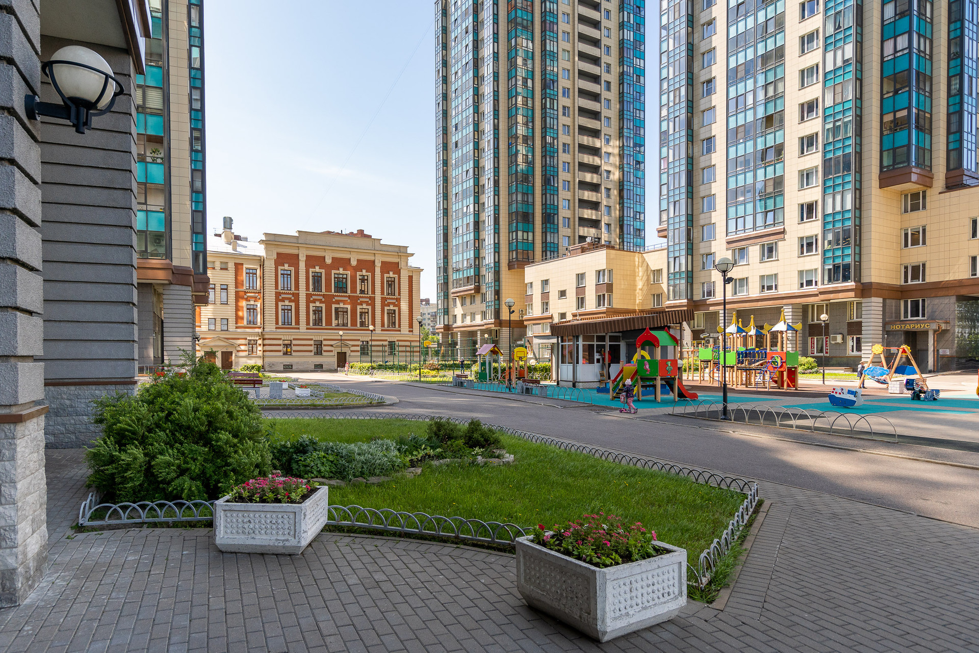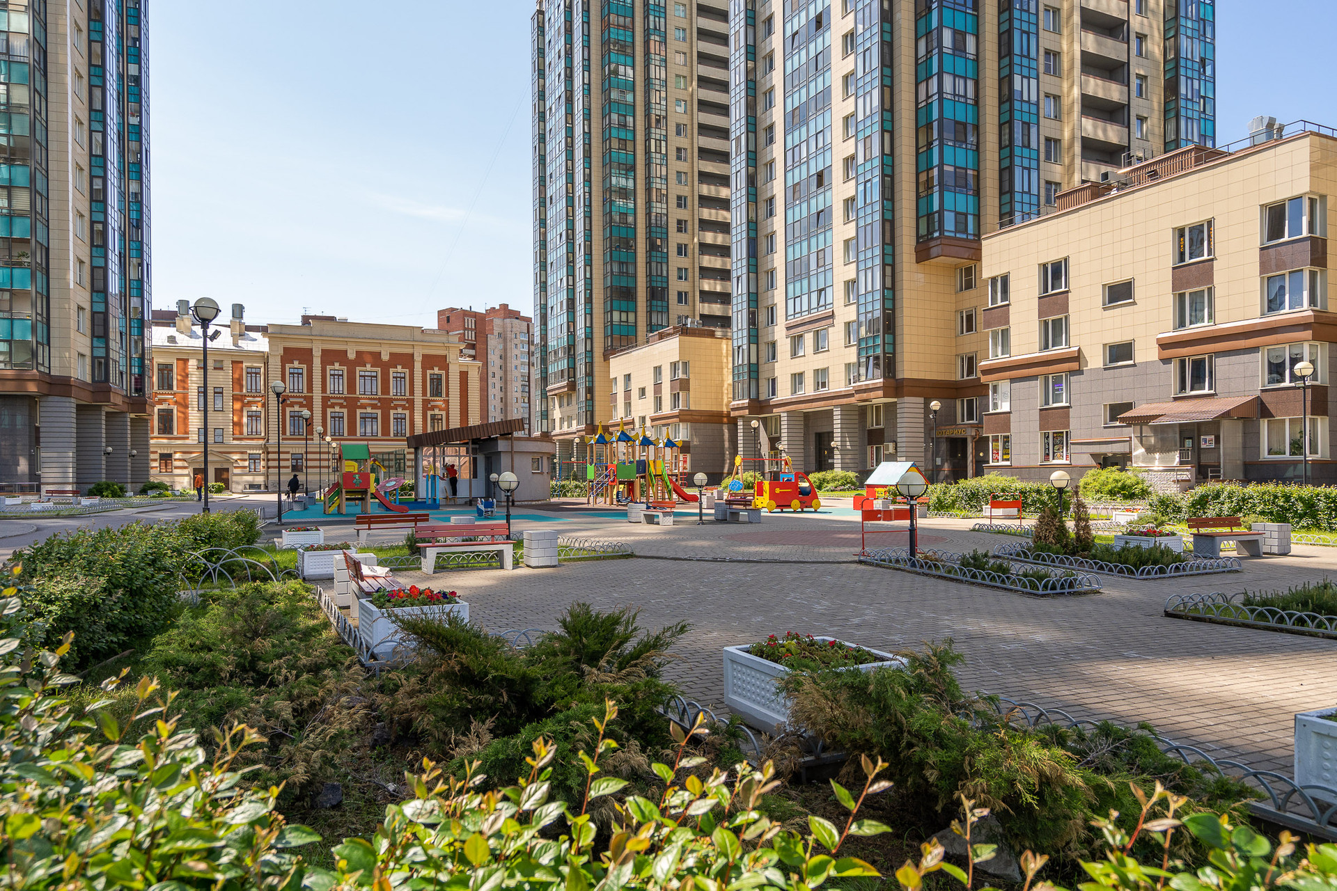 На территории двора детская и спортивная площадки, зоны отдыха, магазин и кафе.