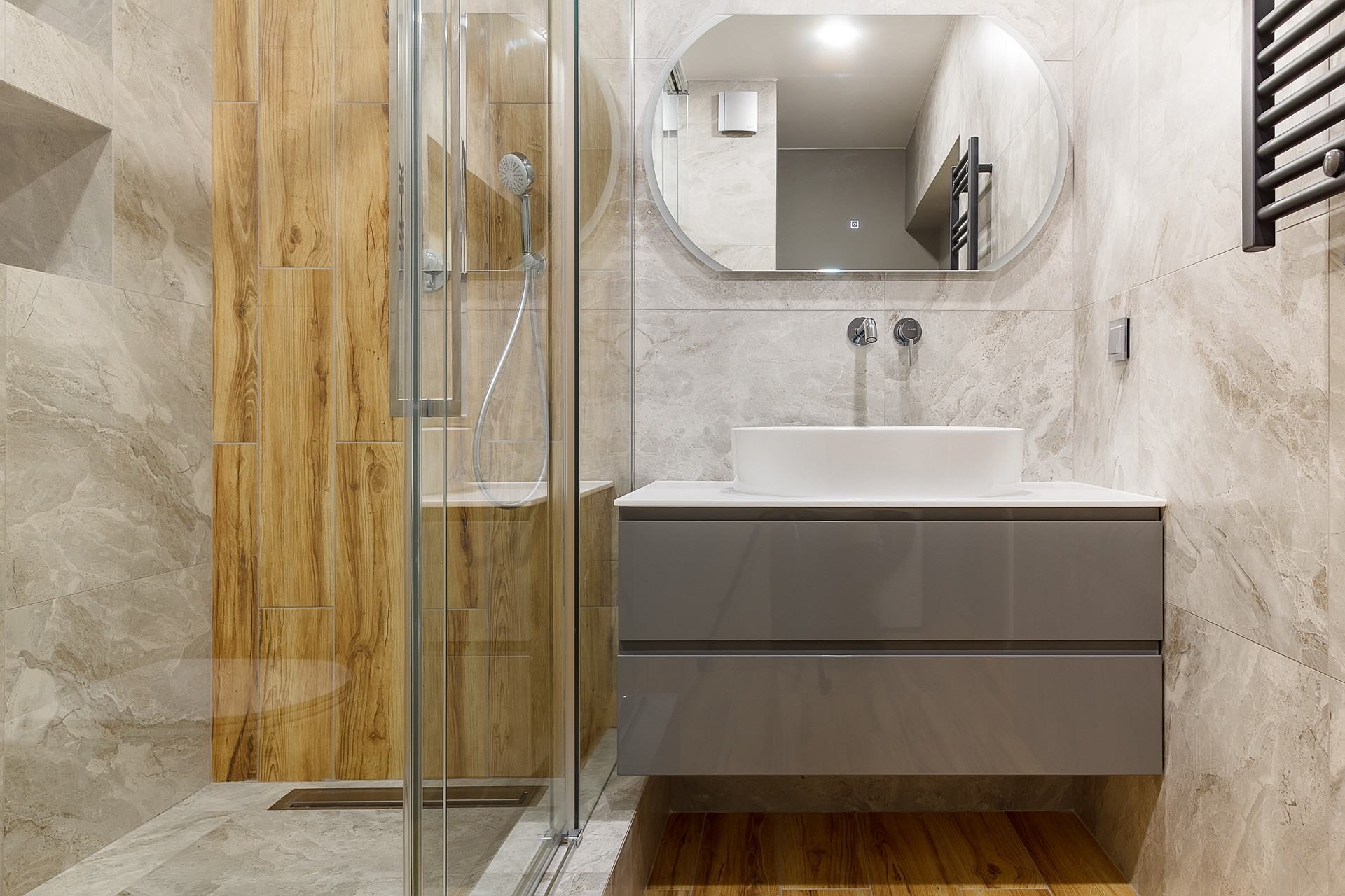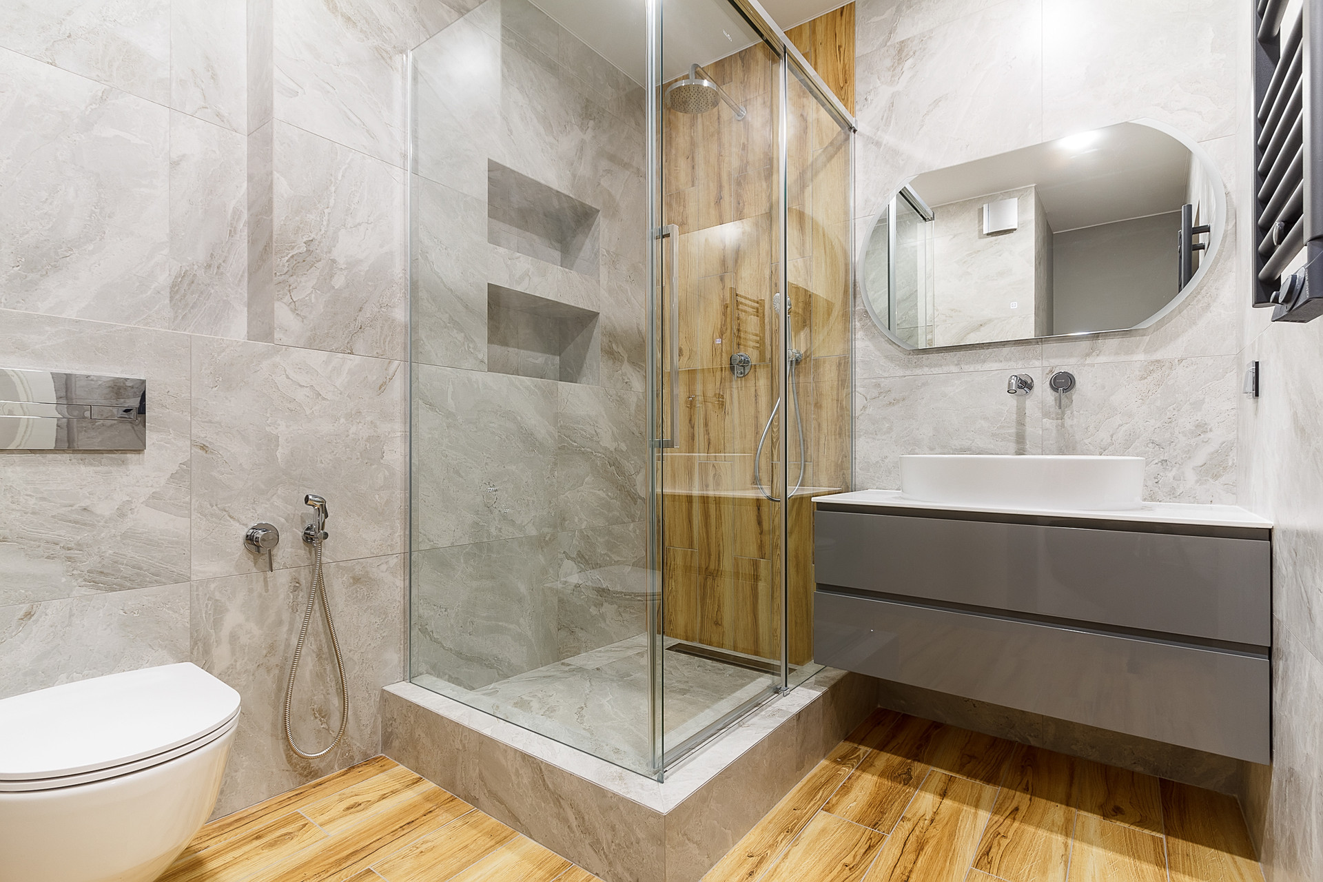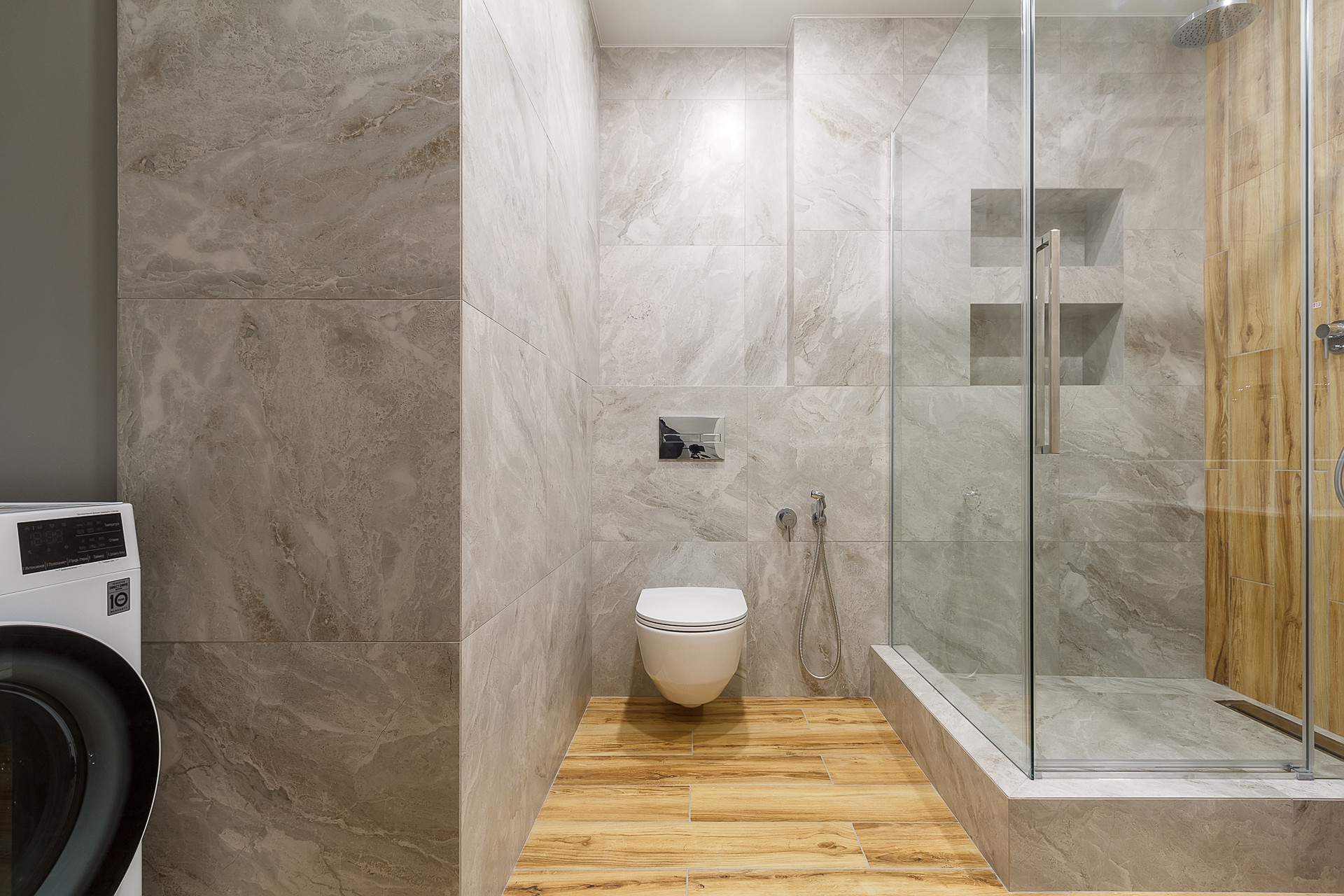 Большой совмещенный санузел с качественной сантехникой.