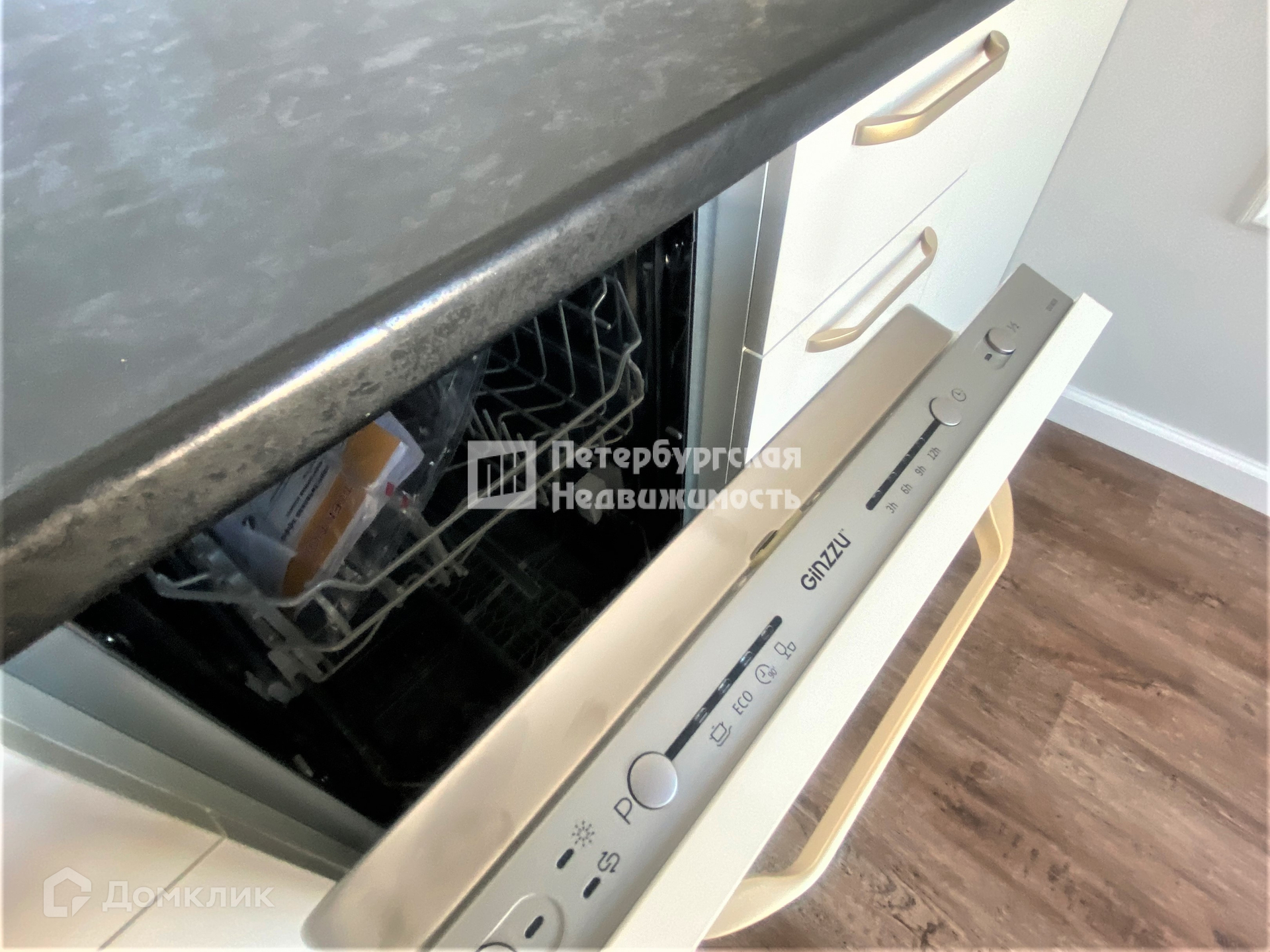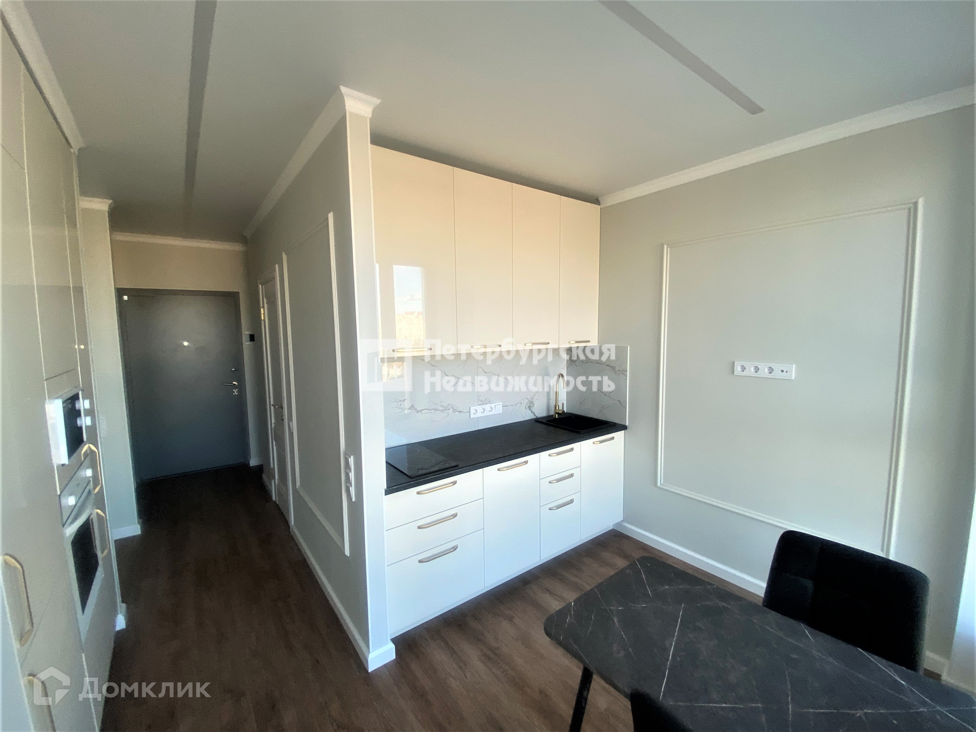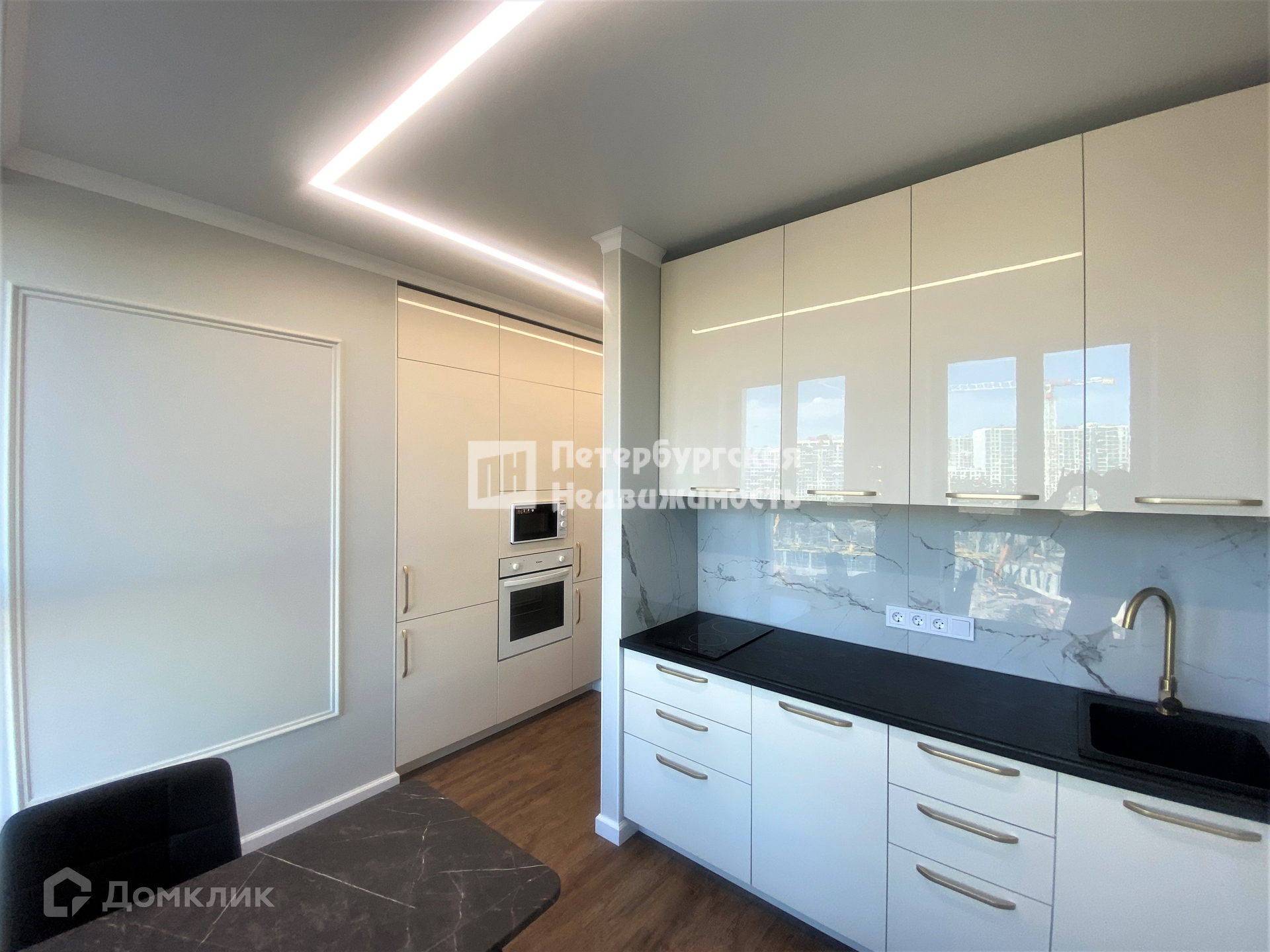 Установленн кухонный гарнитур с встроенной техникой, организована обеденная зона.