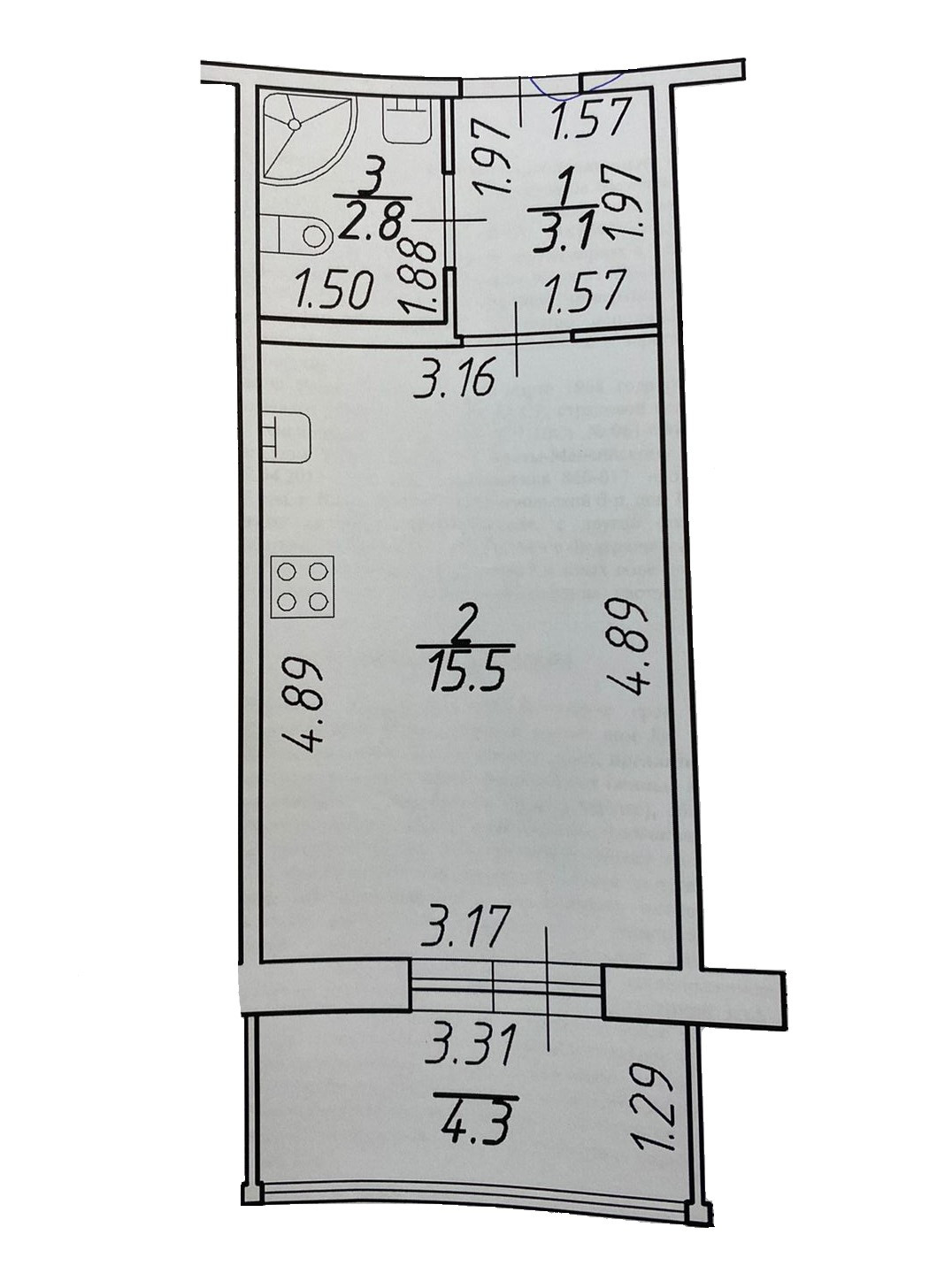 Студия общей площадью 21.4 м2 + балкон 4.3 м2. Жилая комната 15,5 м2. Прихожая 3.1 м2, слева вдоль стены ниша под гардероб. Квартира расположена на 2-м этаже. Окна выходят во двор, солнечная сторона.