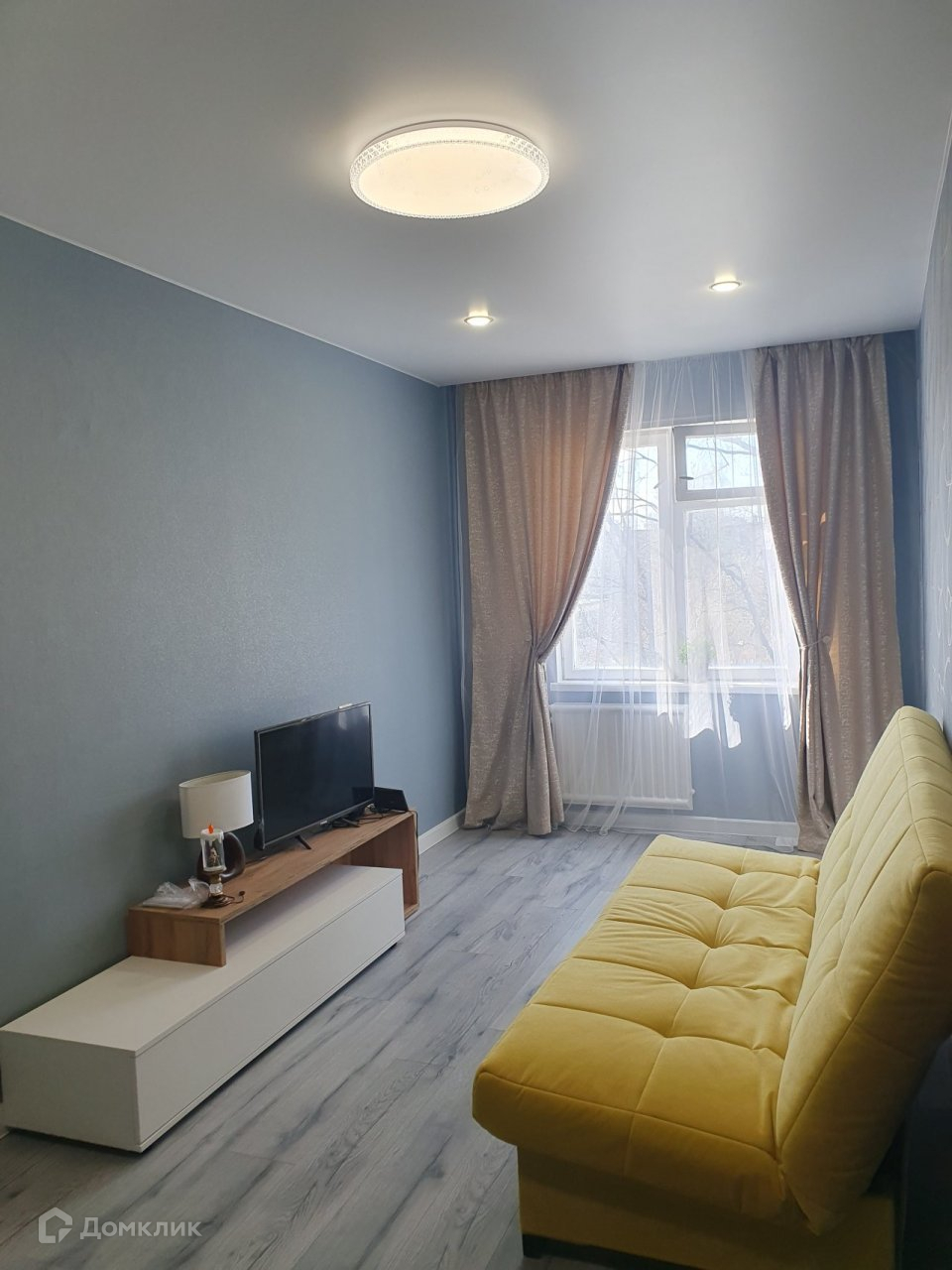 Потолки    натяжные с красивыми    светильниками  и  дополнительным освещение во всех комнатах, регулируемые  по  яркости и   цвету освещения .