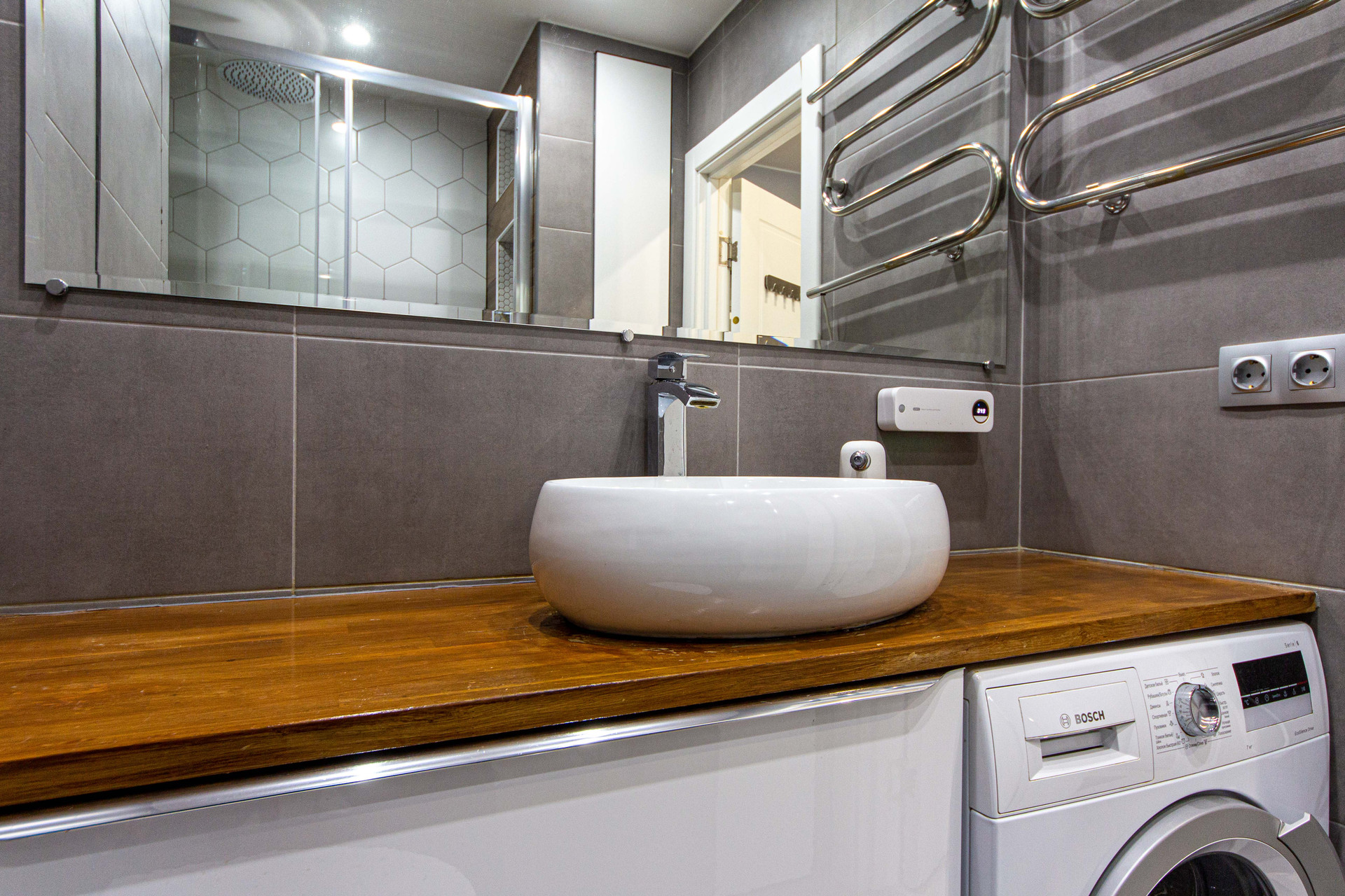 рядом с зеркалом поставлены дополнительные розетки для фена, сушилка для зубных щеток.