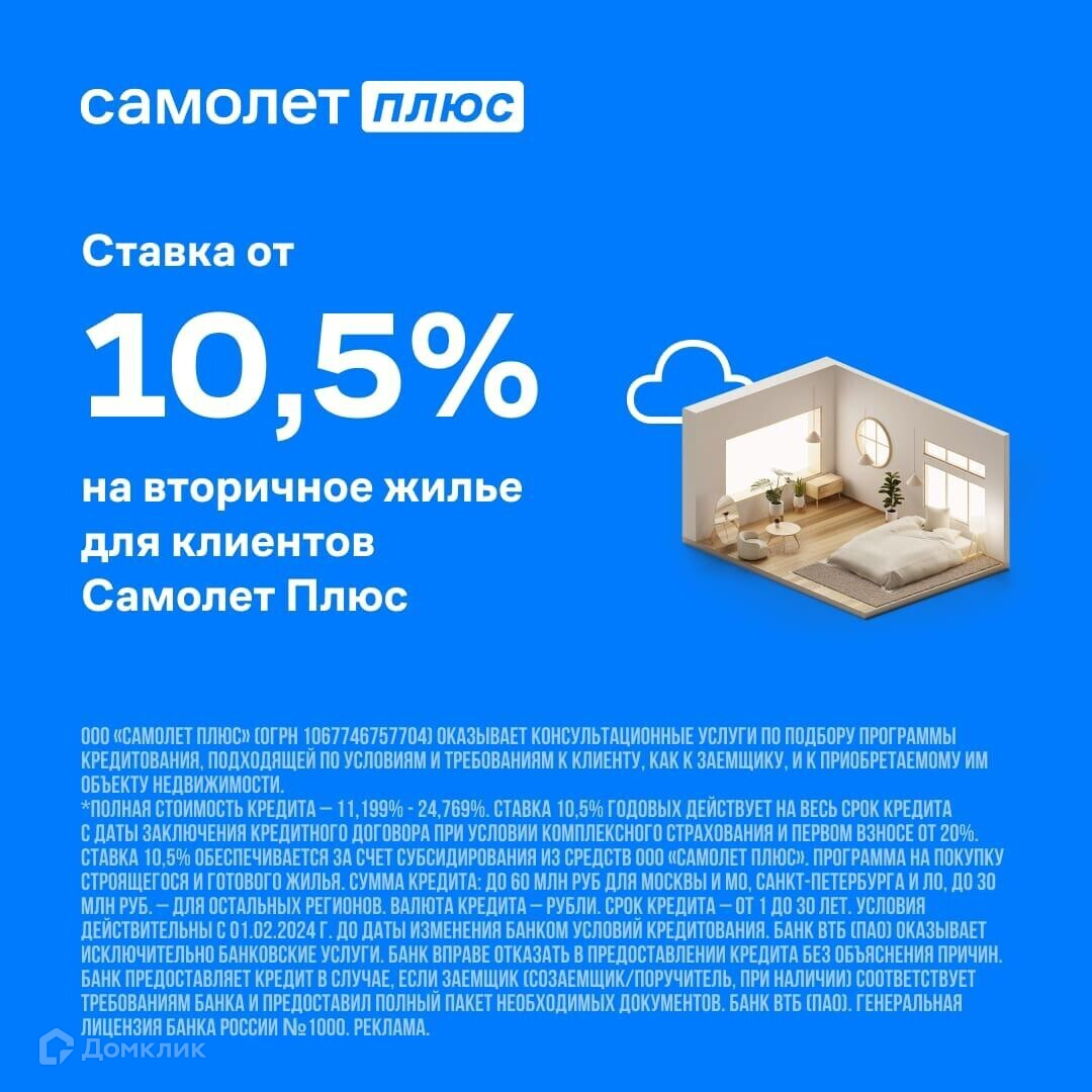 Эксклюзивная ипотечная ставка от 10.5 % ВТБ | СовкомБaнк только при сотрудничестве с Самолет Плюс, что позволить Вам сэкономить по еж.платеж на 21 000 руб. и уменьшить переплату на 9 900 К за период пользования ипотекой, при базовых условиях (ПВ 20% , срок 30 лет) с средней текущей ставкой по рынку в 17%