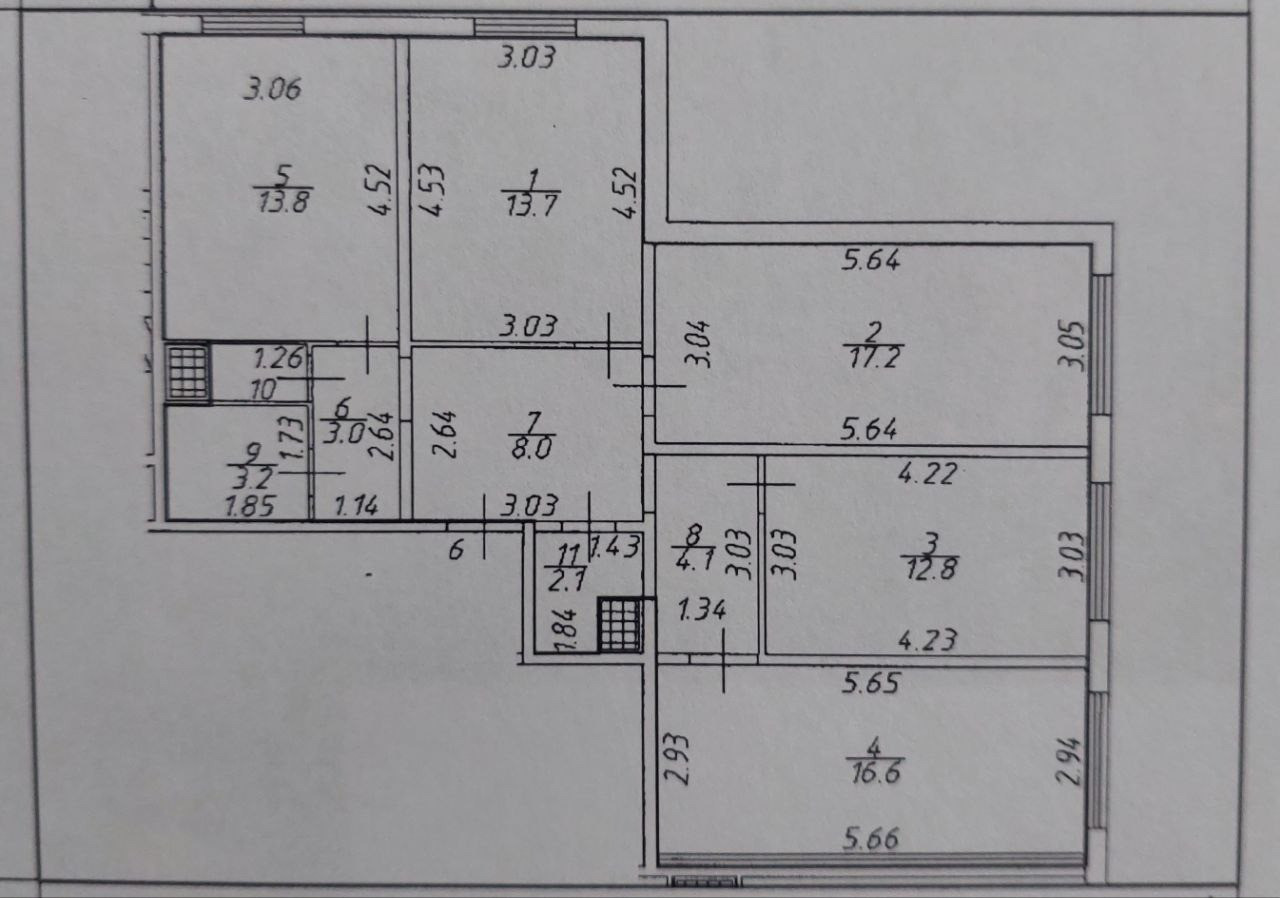 Светлая и удoбная плaниpoвкa, oбщaя площадь 95,5 кв.м. Куxня - 13,8 кв.м и четыре изолированные комнаты: 13,7 кв.м., 17,2 кв.м., 12,8 кв.м., 16,6 кв.м. Раздельный санузел. Просторная прихожая. Есть гардеробная.