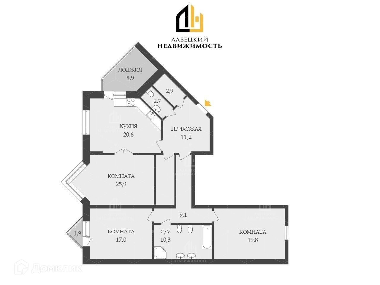 – Три ИЗОЛИРОВАННЫЕ комнаты: 19,8 м² правильной прямоугольной формы, 17 м² с выходом на балкон, гостиная 25,9 м² с эркерным окном, которое визуально увеличивает пространство;