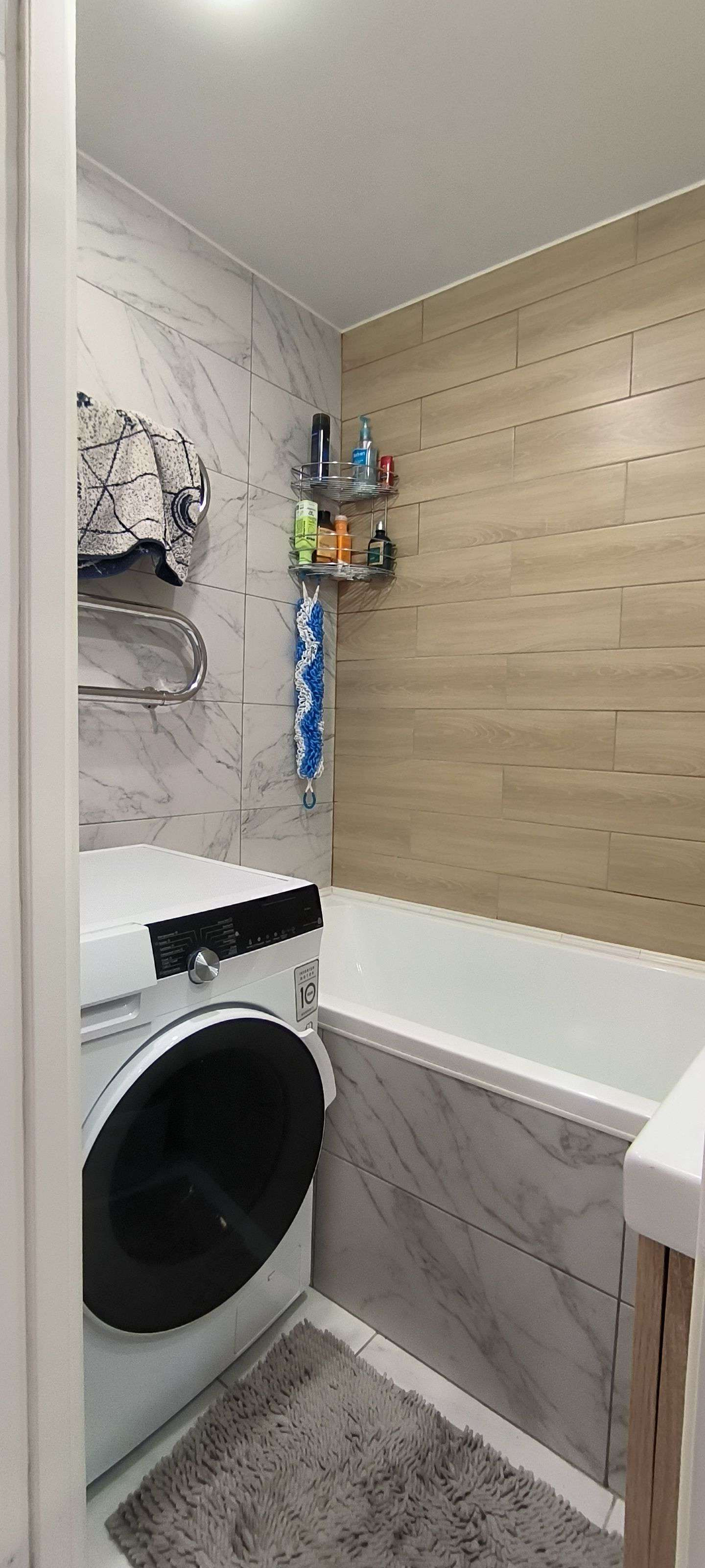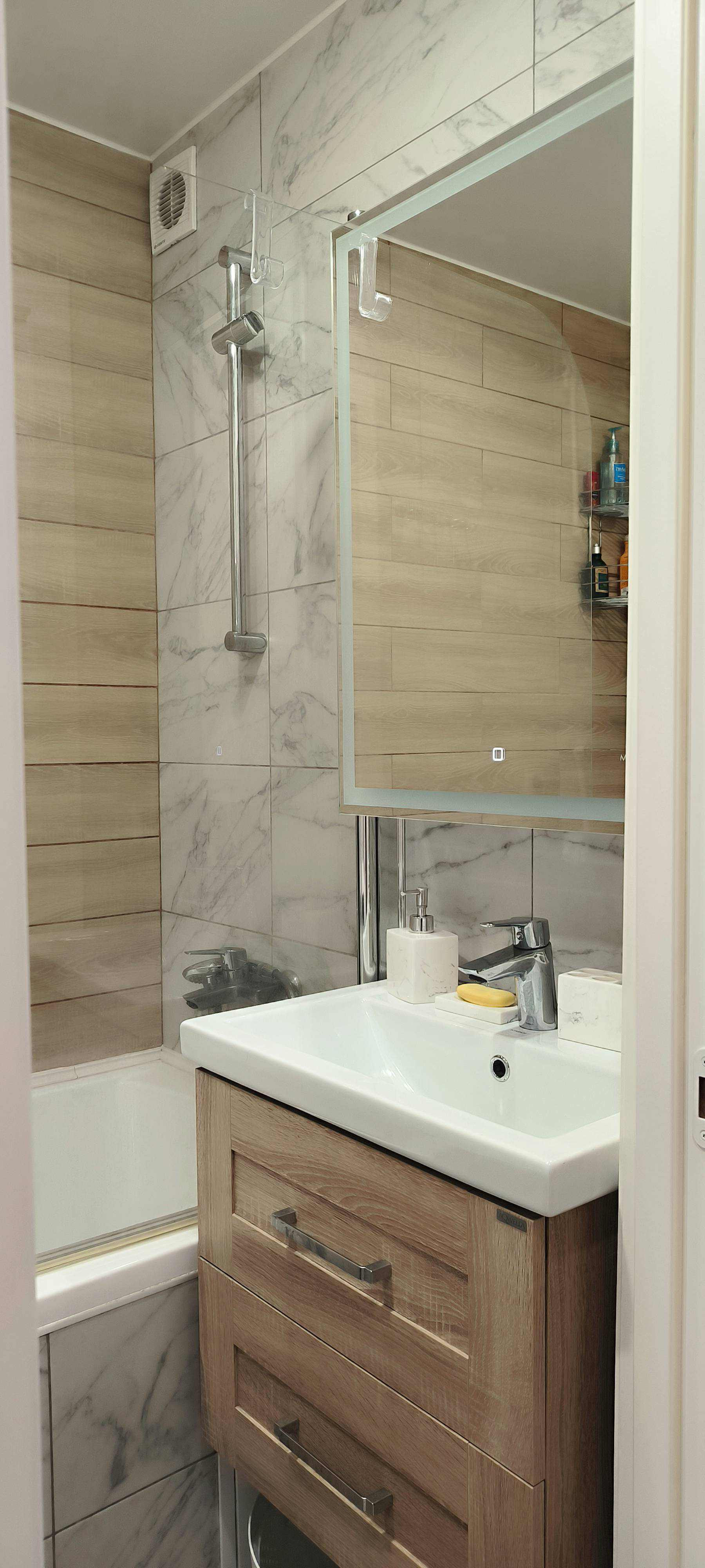 * Пол: прихожая, кухня, ванна и туалет - керамогранит Carrara