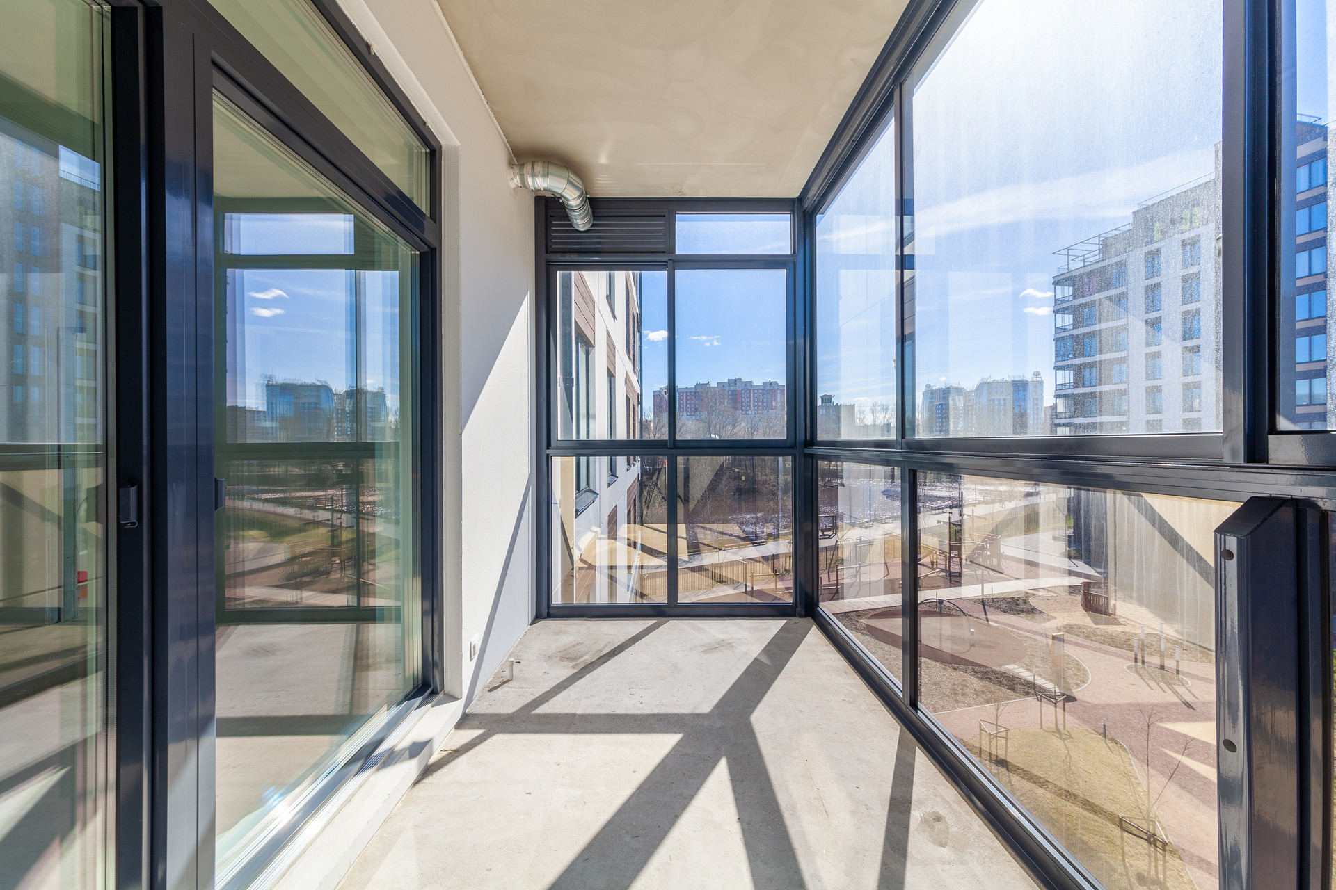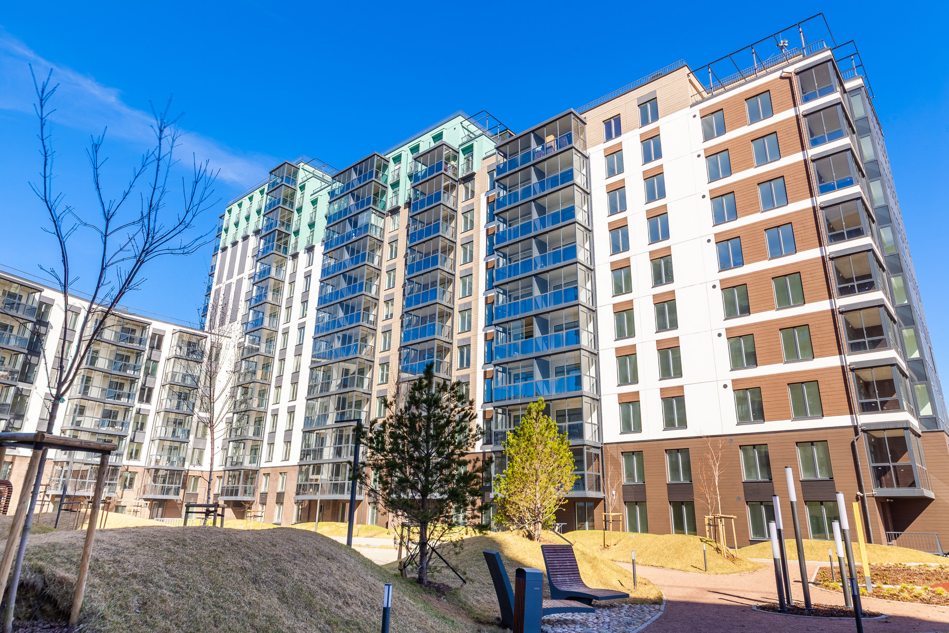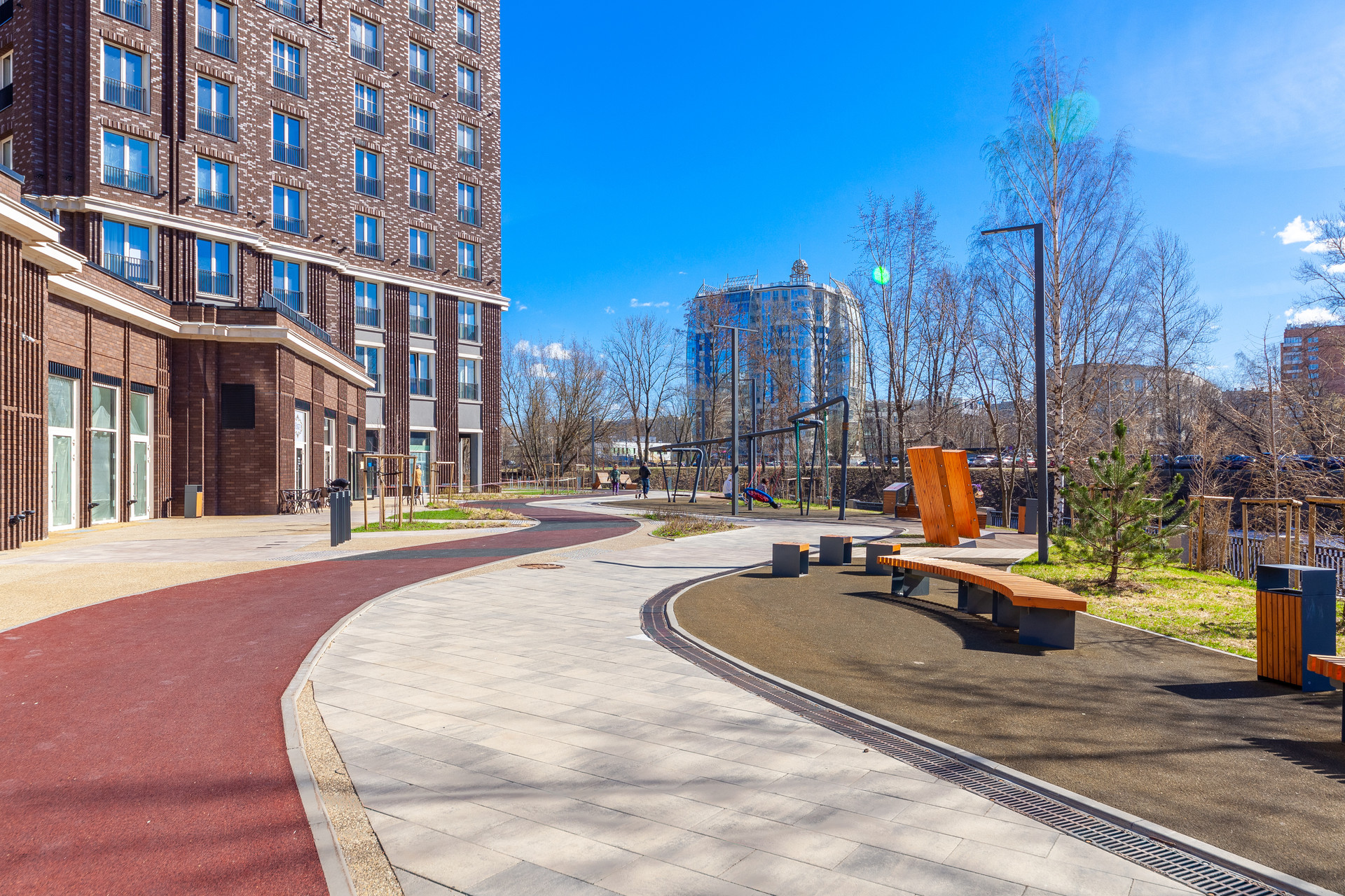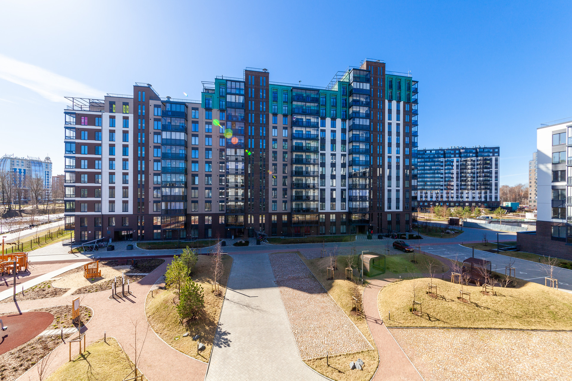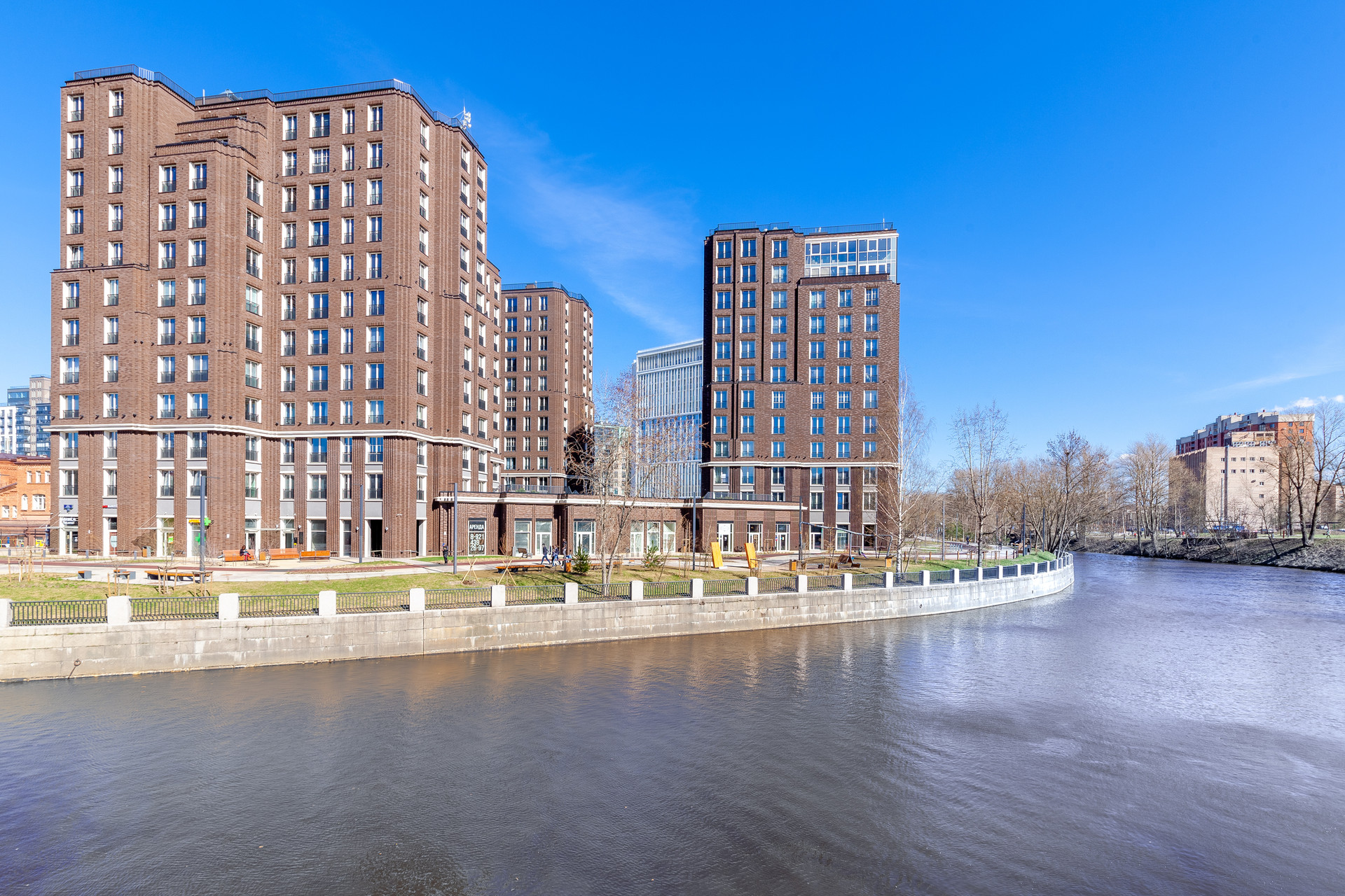Развитая инфраструктура: детские сады, школы, спортивные и развлекательные центры, прогулочная зона вдоль набережной реки Охта