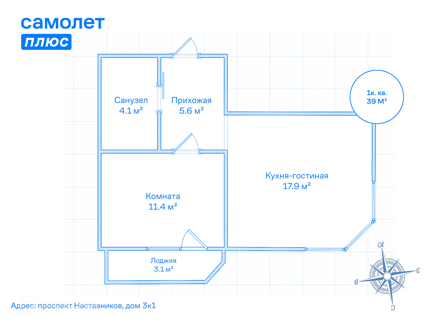 1-комнатная квартира, 39 м2, этаж 11 / 12, на продажу в Санкт-Петербурге, проспект Наставников, 3