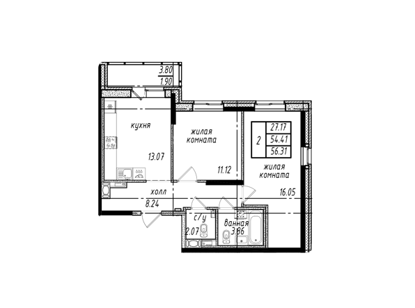 Общая площадь 56.31 м2