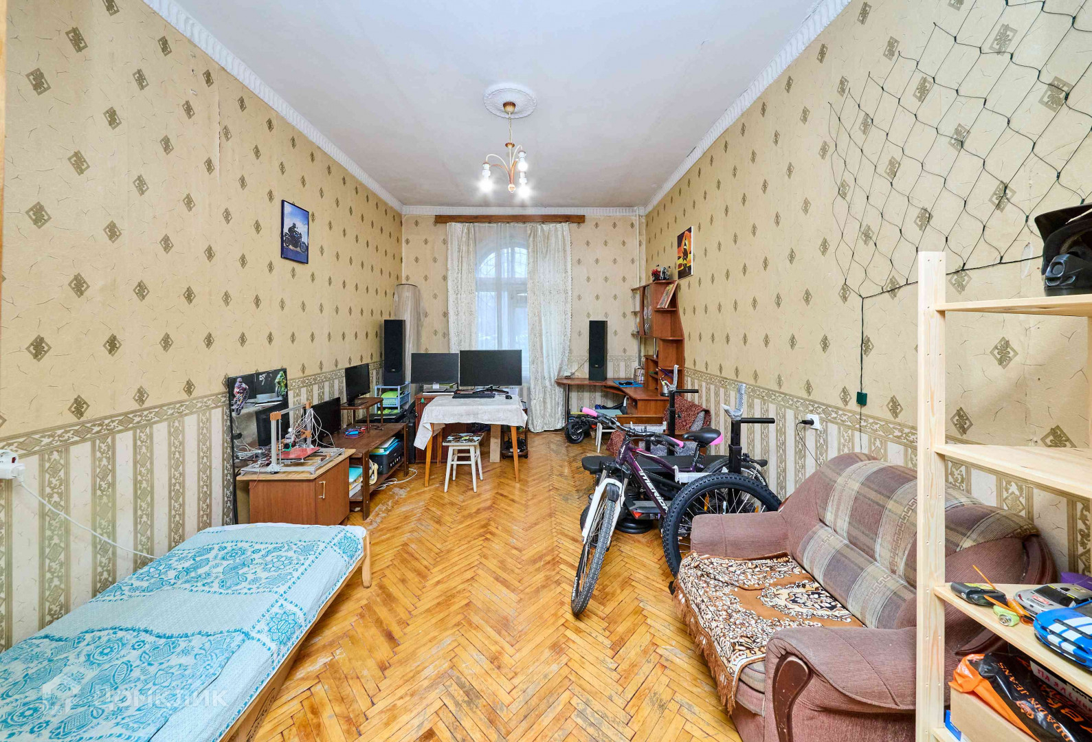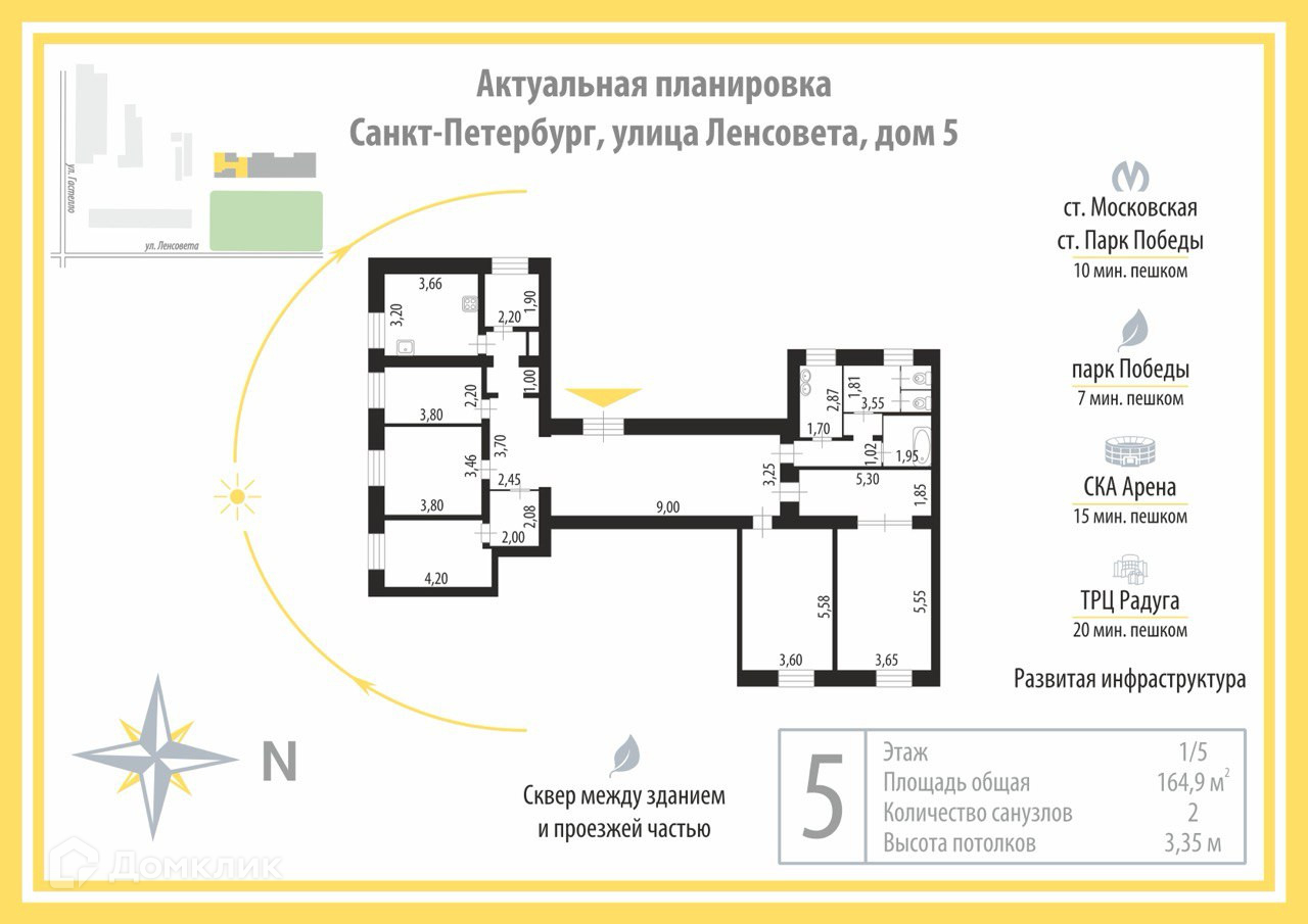 Арт. 63847803 Просторная семейная квартира в одном из лучших и самых зелёных районов города!Общая площадь квартиры 164,9 квадратных метра, высокие потолки 3,35 метра, окна выходят на 3 стороны – восток, юг и запад Есть возможность перепланировки и оптимизации помещений на свой вкус – можно увеличить кухню, добавить ванную комнату, санузел, организовать гардеробные и системы хранения, оборудовать второй уровень благодаря высоким потолкамВысокий первый этаж и большие арочные окна, благодаря чему квартира очень светлая, установлены стеклопакеты. Всего одна квартира на этаже, ухоженная параднаяДобротный сталинский дом 1953 года постройки с кирпичными стенами и железобетонными перекрытиями, расположен в сложившемся обжитом микрорайоне, в отдалении от многоэтажных густонаселённых жилых комплексов. Московский район славится как один из самых удобных для жизни и занимает лидирующее место благодаря развитой социальной, транспортной и торговой инфраструктуре, а расположение дома действительно очень удачное:- в 10 минутах станции метро Московская и Парк Победы- до Парка победы 7 минут пешком- напротив дома расположен детский садик № 145 , до которого Вы дойдёте всего за одну минуту- во дворе престижная 526 гимназия- в 5 минутах пешком несколько школ и физико-математический лицей № 366- государственный университет аэрокосмического приборостроения- экономико-технологический колледж питания- международный образовательный центр ИТМО- рядом множество магазинов, кафе, рестораны, спортивные клубы, салоны красоты- ТРЦ Радуга в 20 минутах, ТРК Питер в 15 минутах ходьбы- до СКА арены 15 минут- до центра города 15-20 минут на машине или на транспорте- 3 выезда на КАД в 6 километрах- до ЗСД 6 километров - до аэропорта 20 минут