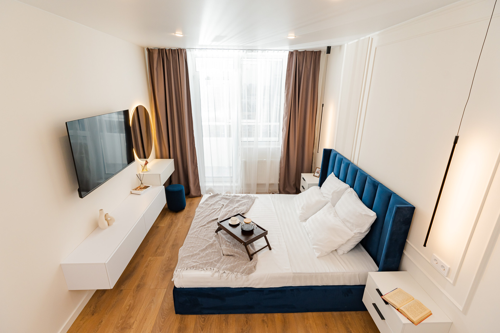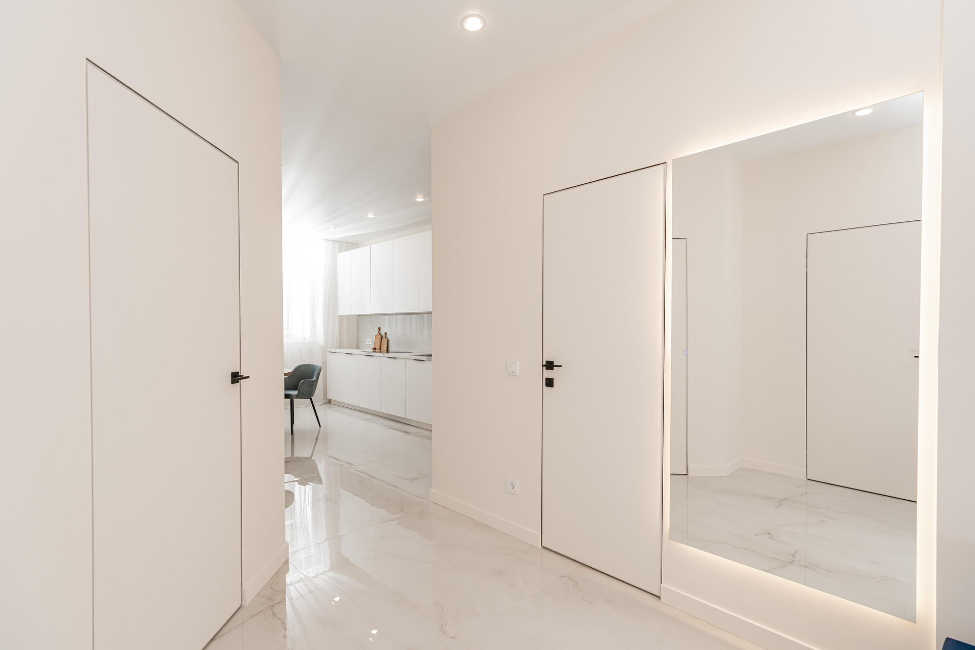 Новая мебель: кухонный гарнитур, кровать с подъемным механизмом 180х200см, матрац, стол и стулья кухонные, подвесные тумбочки, гардеробная комната, зеркала с подсветкой, встроенные шкафы. Теплые полы.
