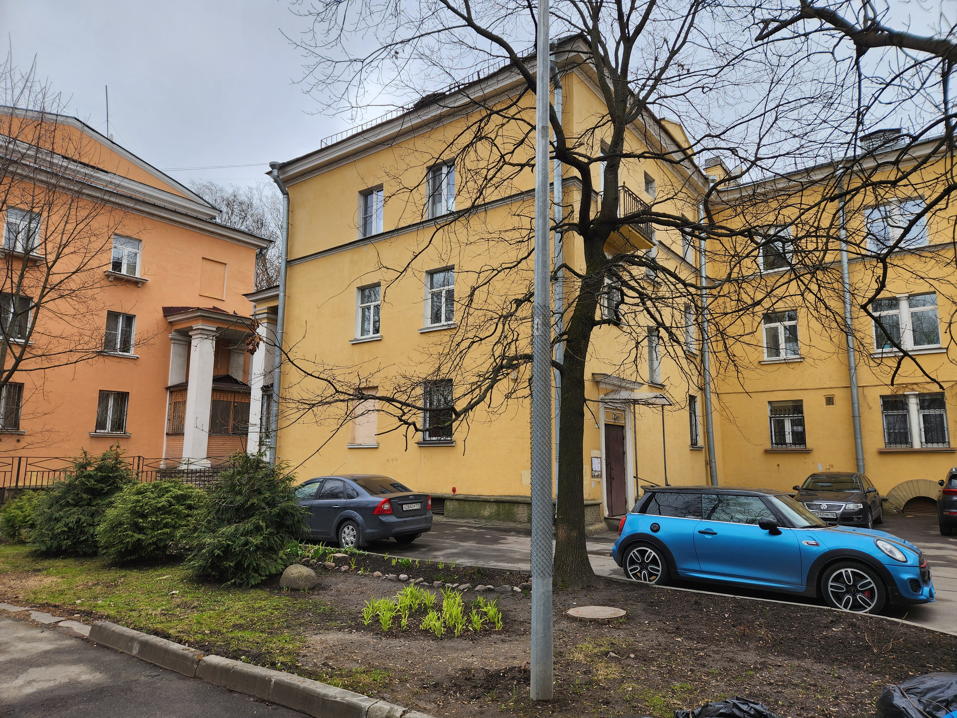 Внутренний двор огорожен, всегда есть свободные места для парковки.