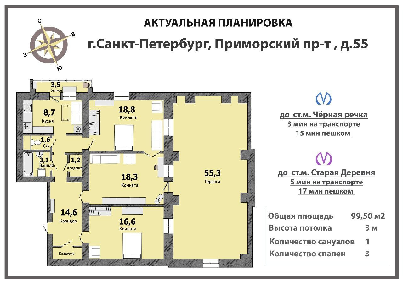 3-комнатная квартира, 99.5 м2, этаж 1 / 3, на продажу в Санкт-Петербурге, Приморский проспект, 55к1