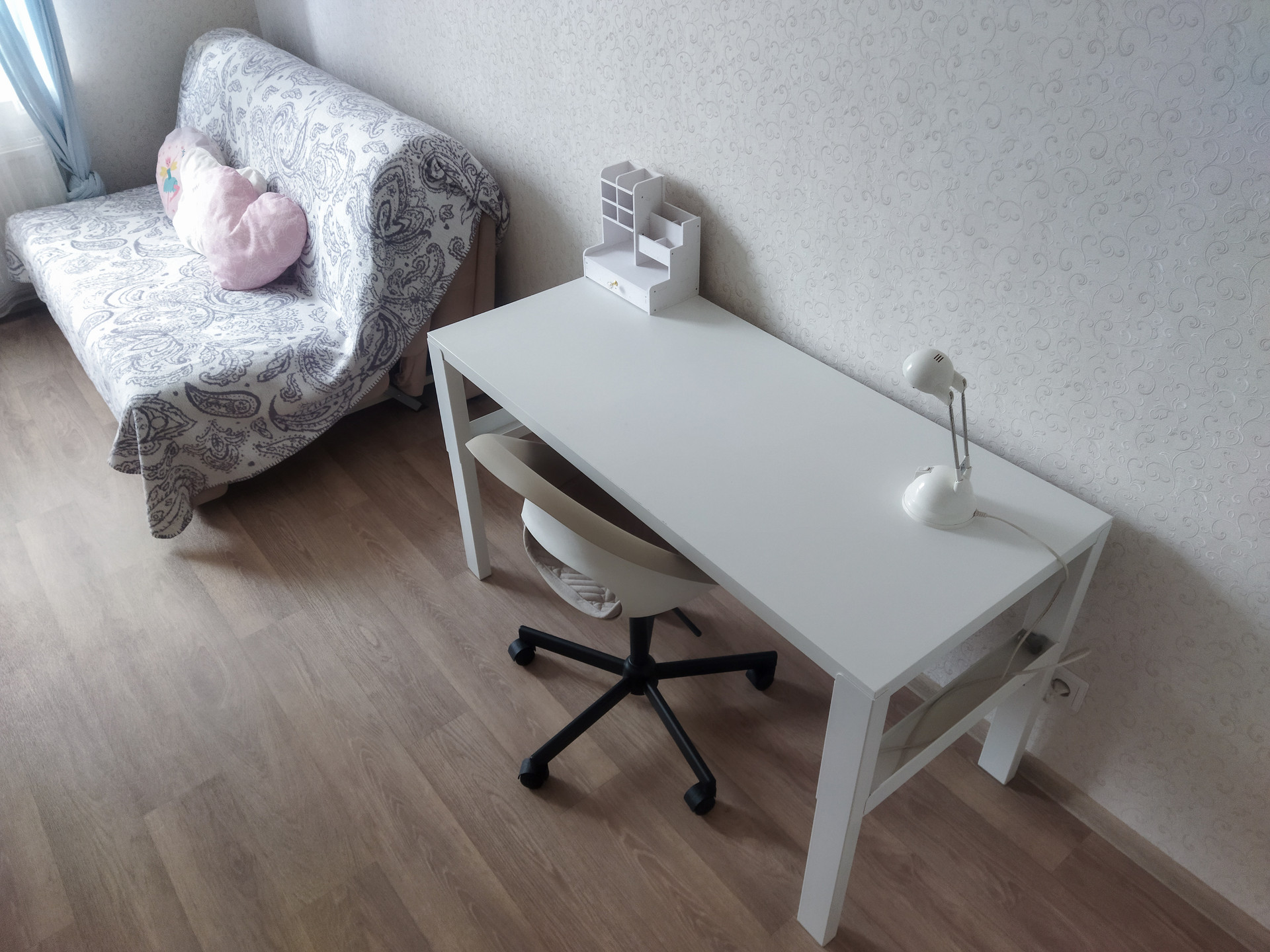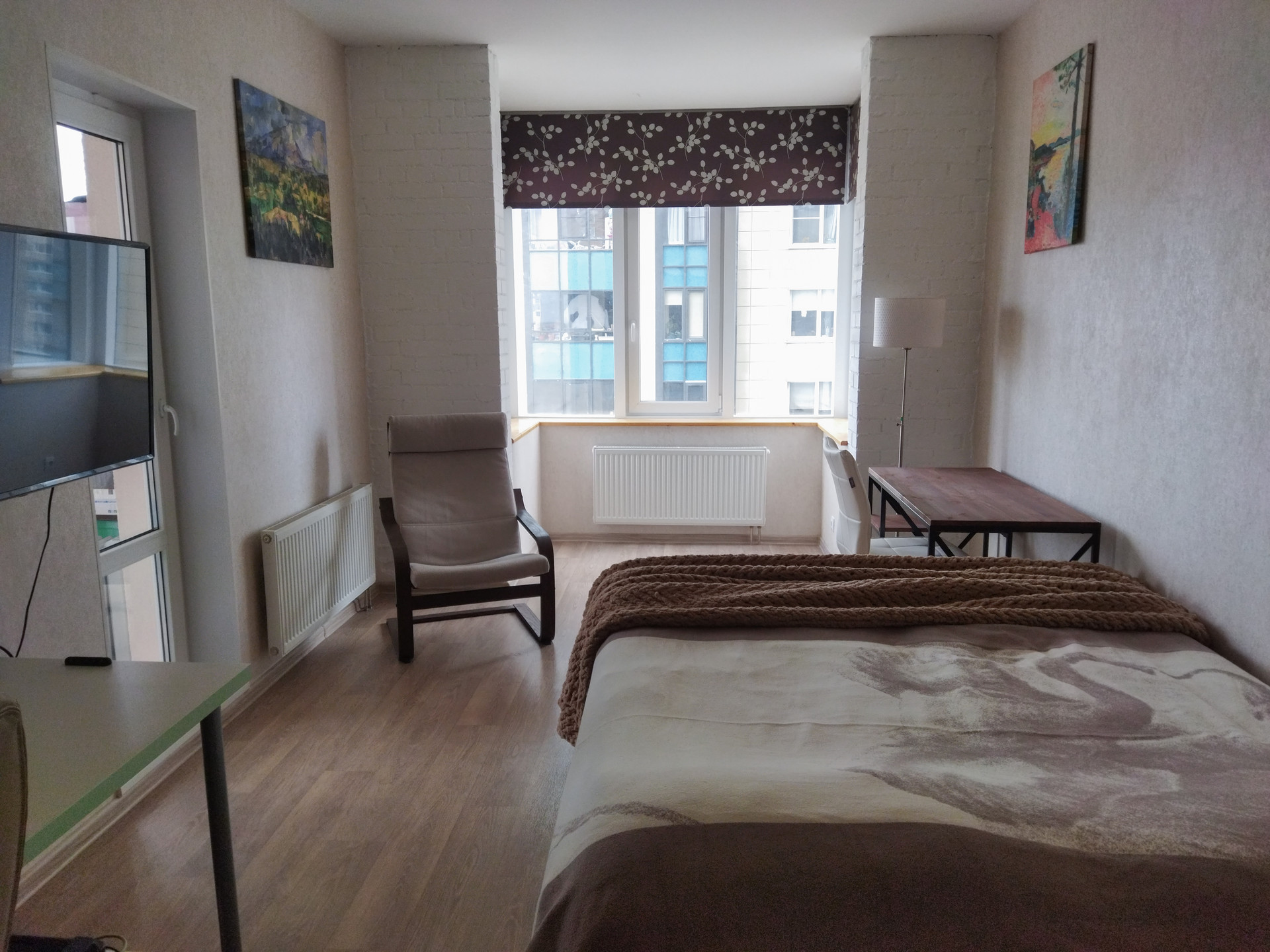 В большой комнате - красивый эркер, оформленный в скандинавском стиле.