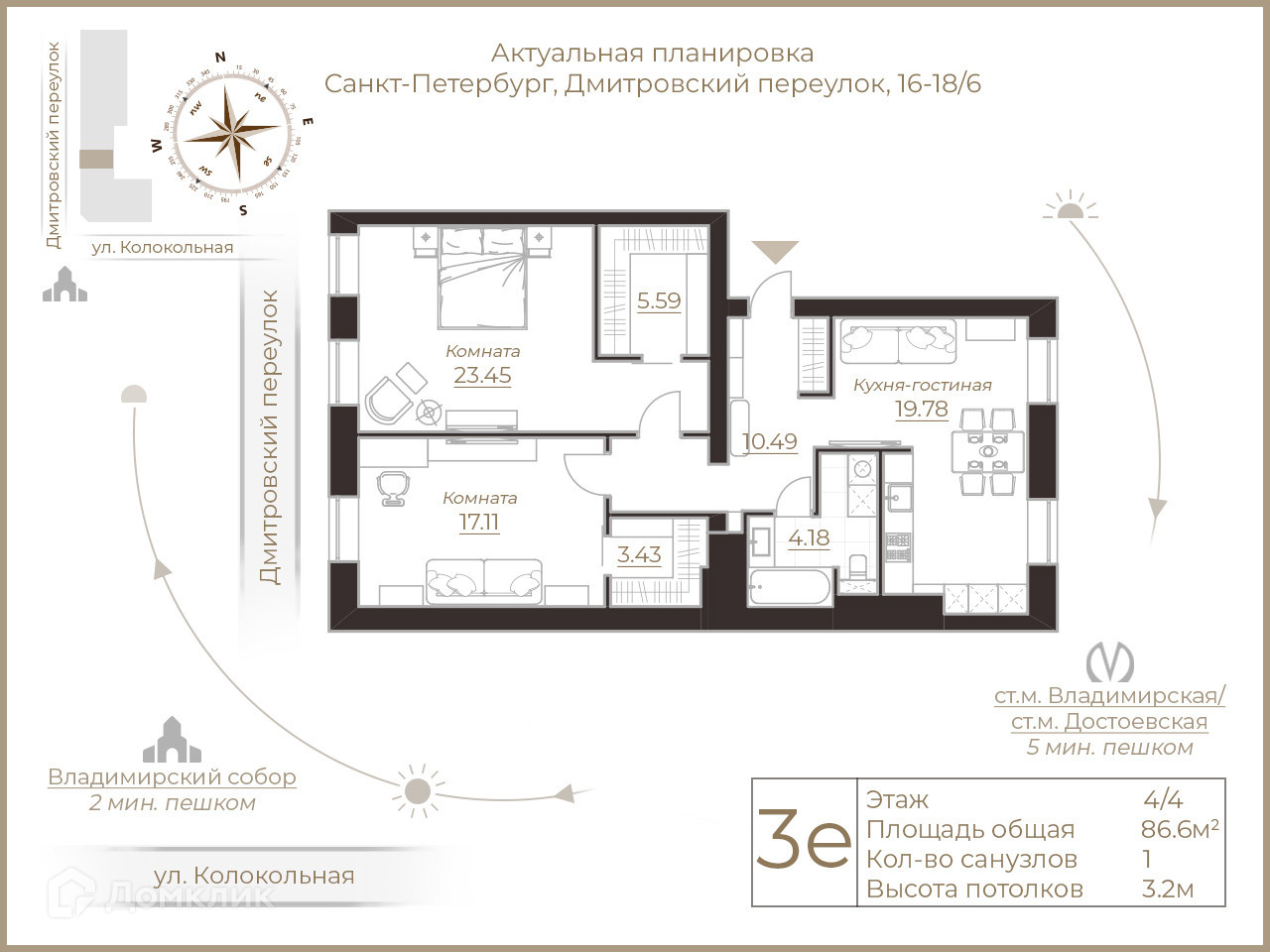 2-комнатная квартира, 86.6 м2, этаж 4 / 4, на продажу в Санкт-Петербурге, Дмитровский переулок, 16-18/6