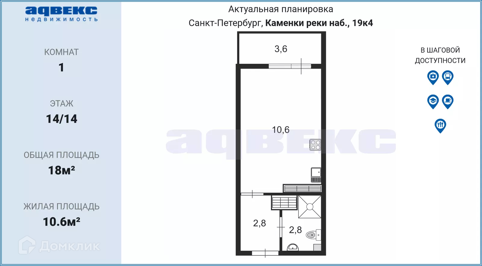 Квартира студия, 18 м2, этаж 14 / 14, на продажу в Санкт-Петербурге, набережная реки Каменки, 19к4