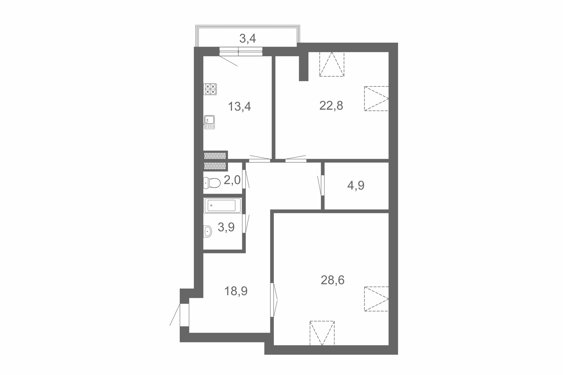 - площадь 94,5 кв.м., комнаты правильной формы 28,6 кв.м., 22,8 кв.м,, кухня 13,4 кв.м. с выходом на балкон ;