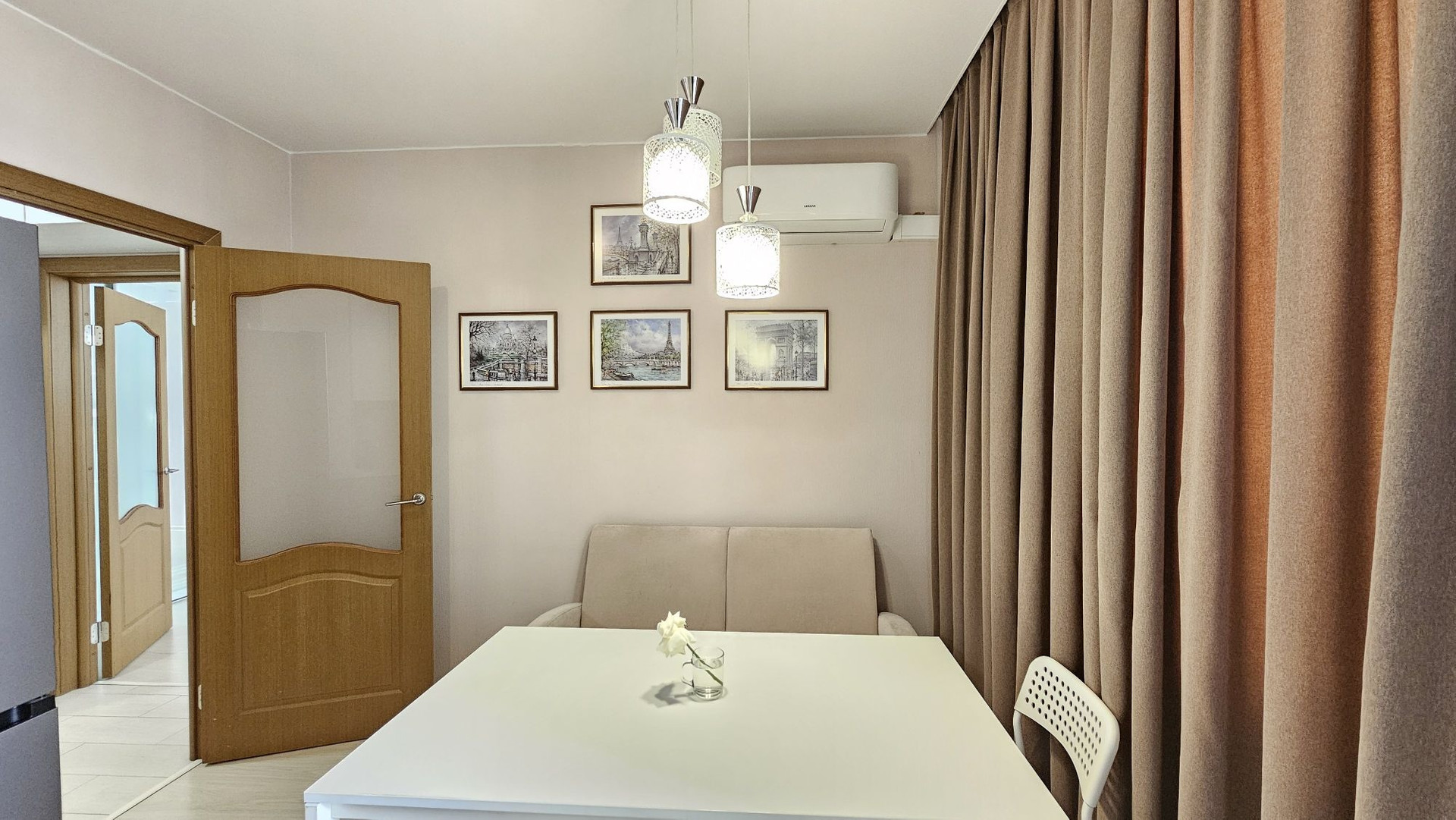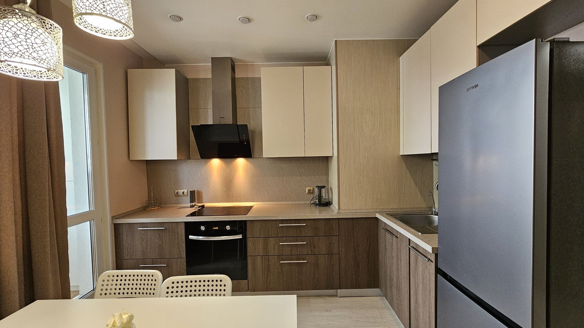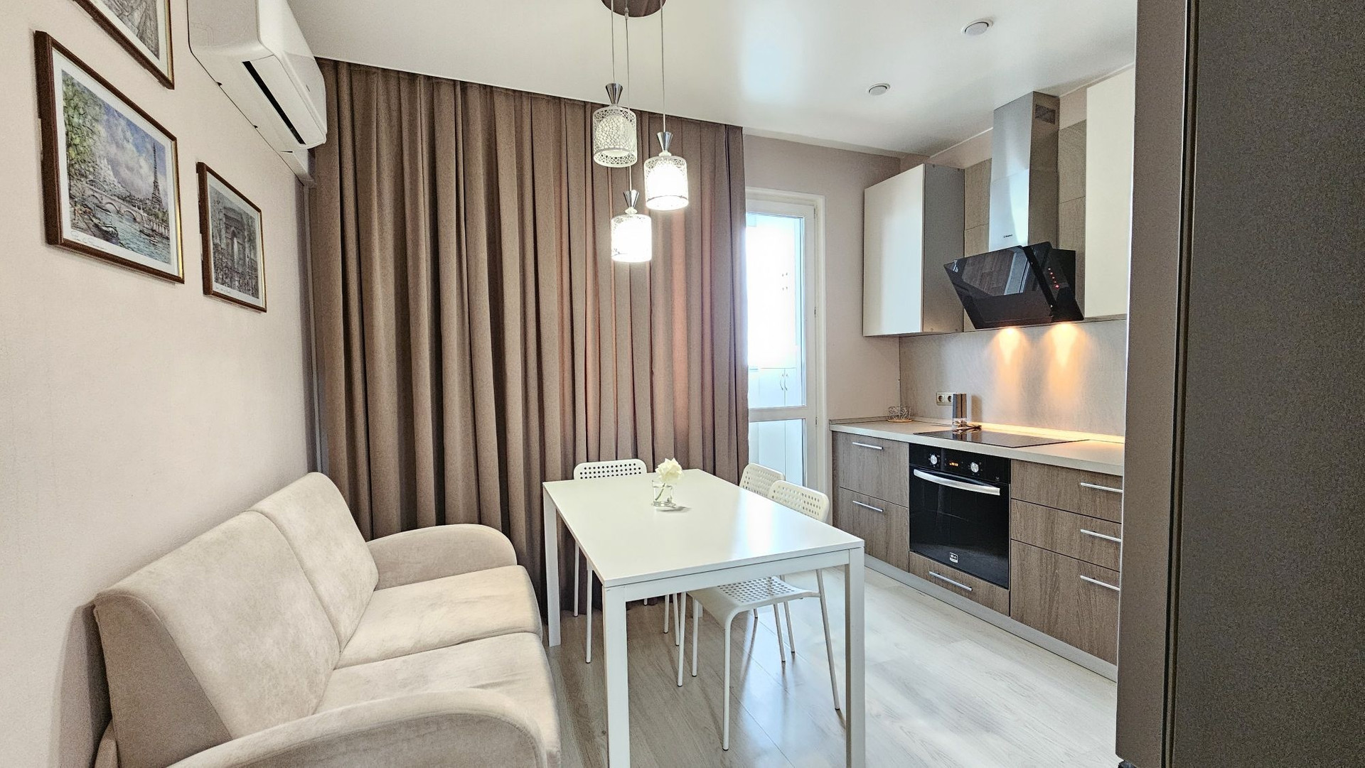 Отличная кухонная мебель с техникой, обеденный уголок (стол и раскладывающийся диван-кровать), кондиционер для комфорта.