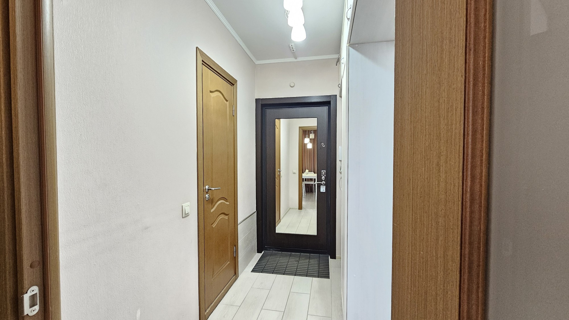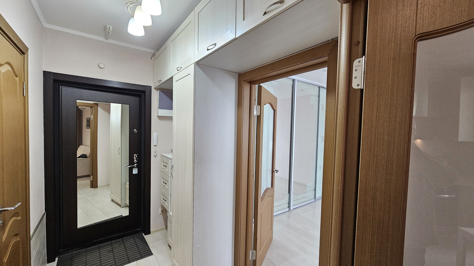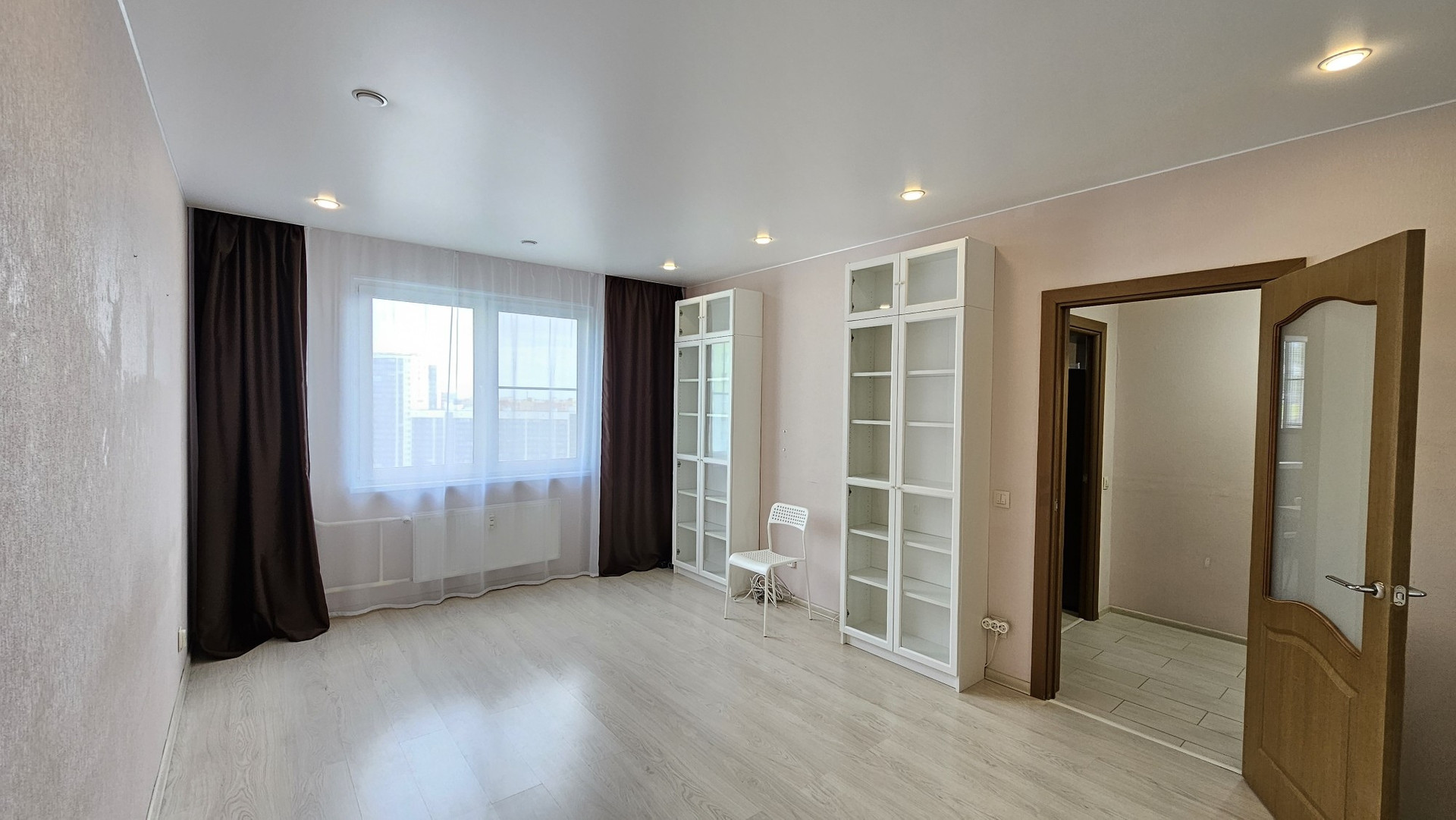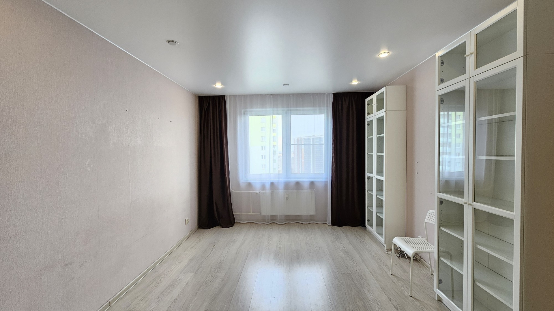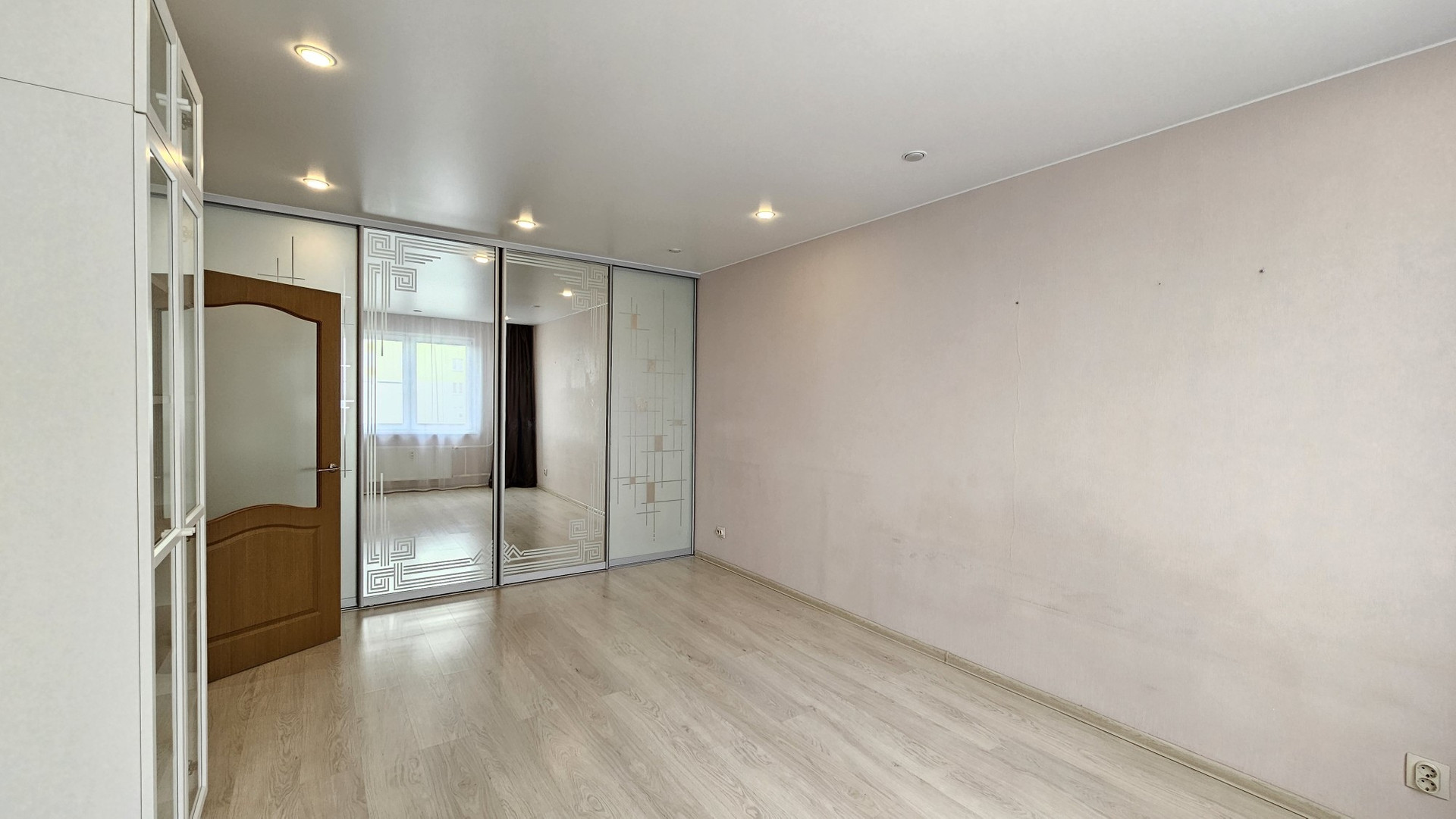 В комнате огромный шкаф-купе с зеркальными дверьми и набор корпусной мебели. Линолеум от застройщика заменен на ламинат. Везде натяжные потолки. Новая входная металлическая дверь высокого качества.