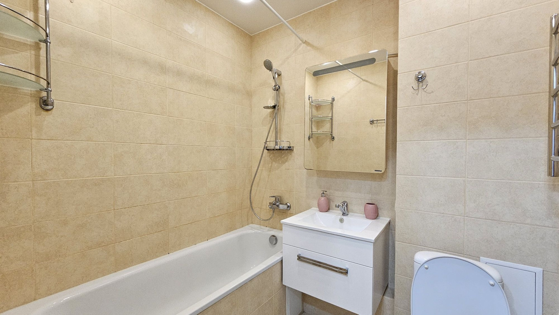 В санузле полноразмерная ванна.  Счетчики прошли поверку.