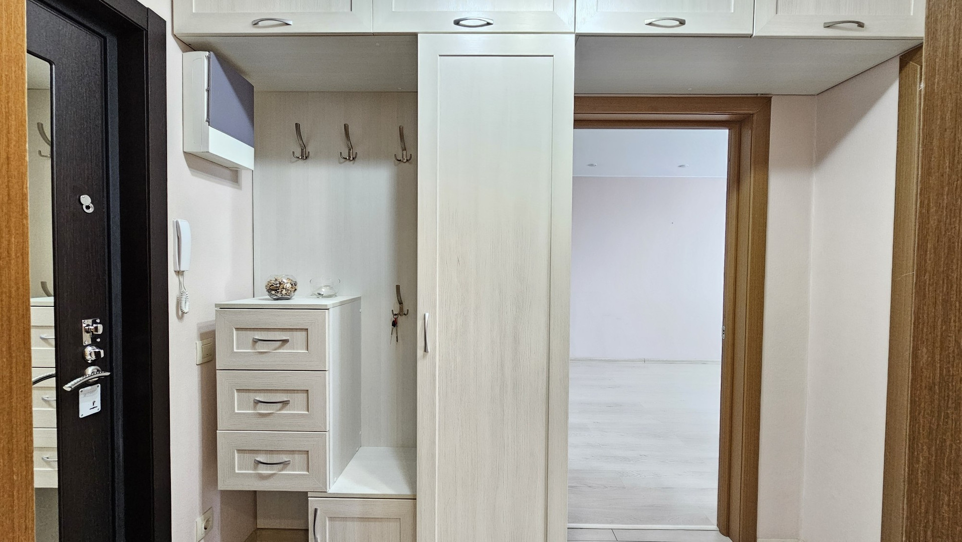 Прихожая при своих компактных размерах позволила установить вместительную систему хранения с полками, антресолью и выдвижными ящиками.