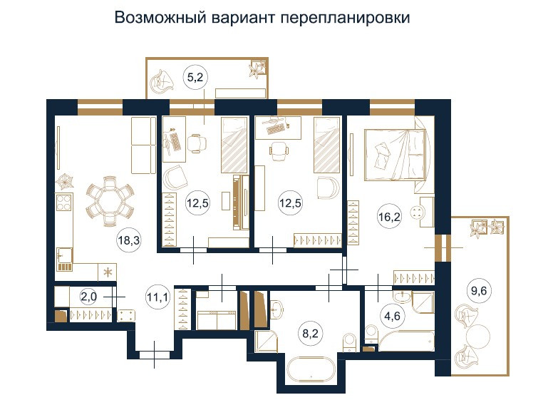 - Подходит под перепланировку (перегородки из легких конструкций).