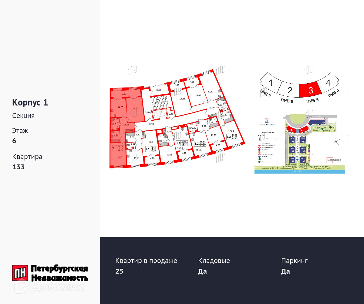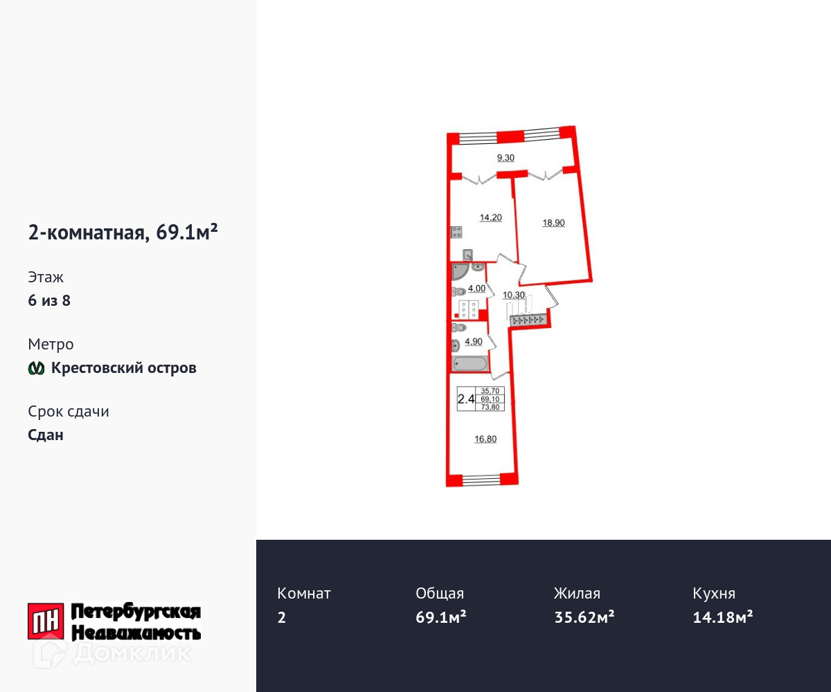 2-комнатная квартира, 69.1 м2, этаж 6 / 8, на продажу в Санкт-Петербурге, Петровский проспект, 28к1