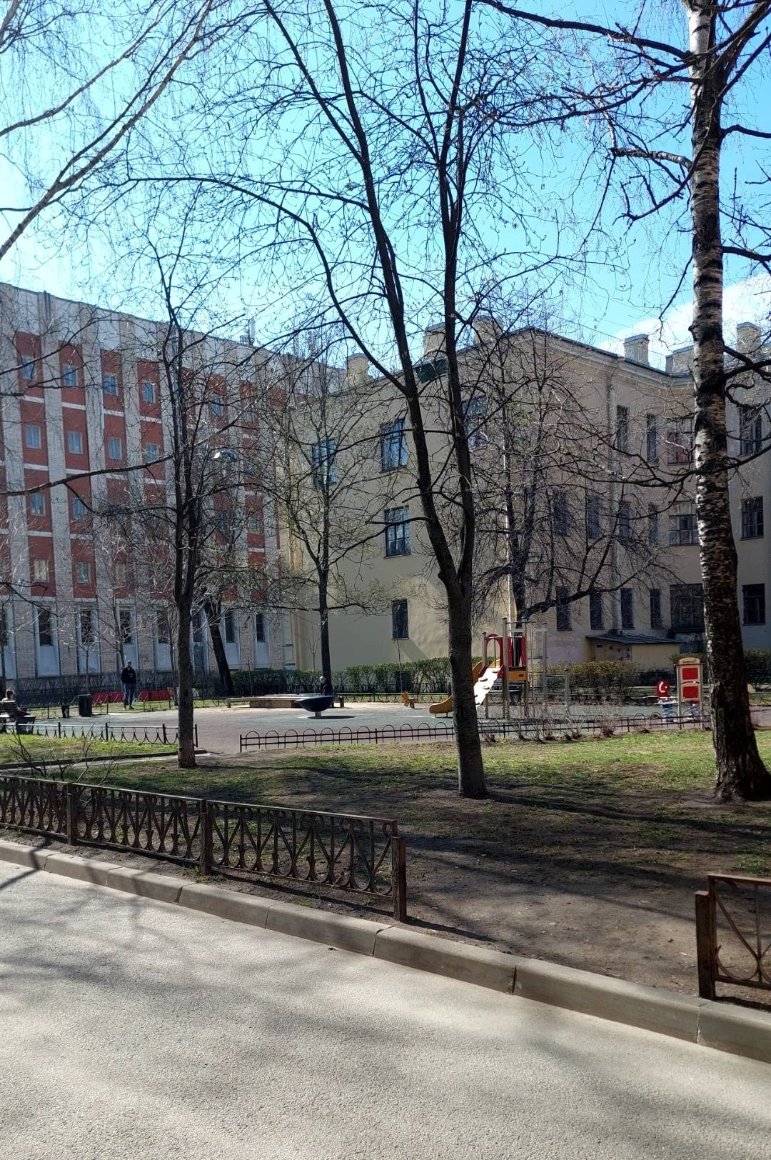 Напротив дома расположена большая детская площадка с зелёными насаждениями и лавлчками