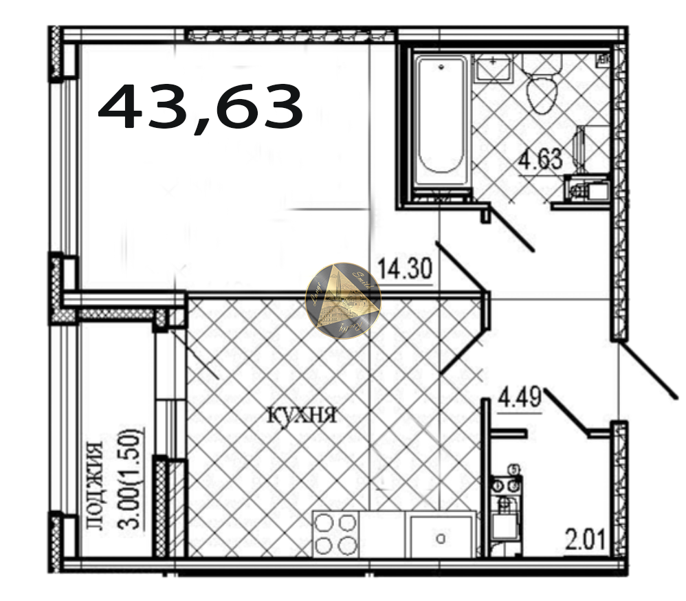 - Общая площадь квартиры 43,63 м2.